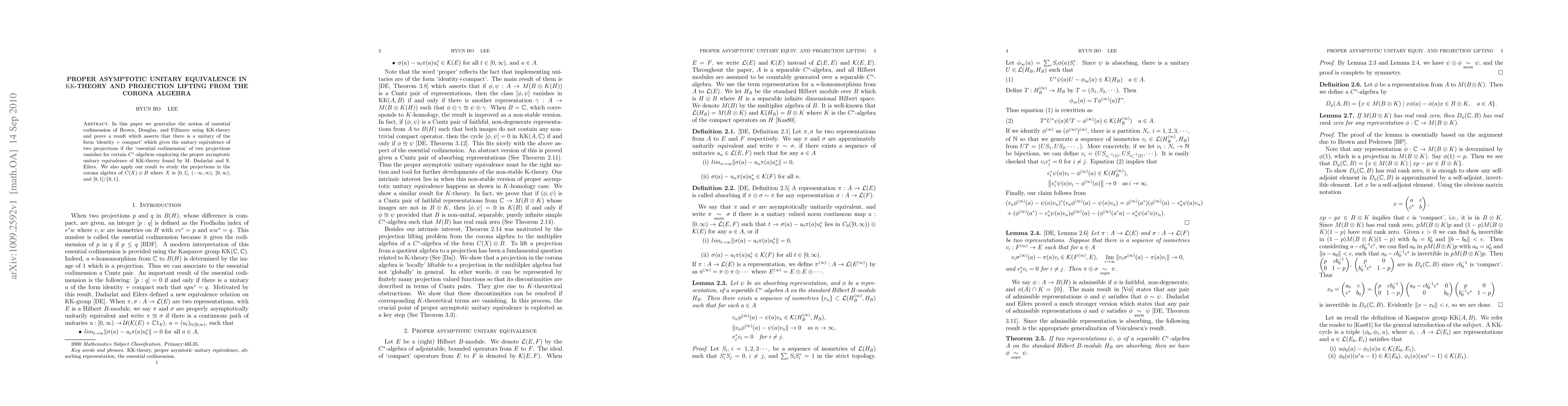 In this paper we generalize the notion of essential codimension of Brown, Douglas, and Fillmore using $\KK$-theory and prove a result which asserts that there is a unitary of the form `identity + compact' which gives the unitary equivalence of two projections if the `essential codimension' of two projections vanishes for certain $C\sp*$-algebras employing the proper asymptotic unitary equivalence of $\KK$-theory found by M. Dadarlat and S. Eilers. We also apply our result to study the projections in the corona algebra of $C(X)\otimes B$ where $X$ is $[0,1]$, $(-\infty, \infty)$, $[0,\infty)$, and $[0,1]/\{0,1\}$.