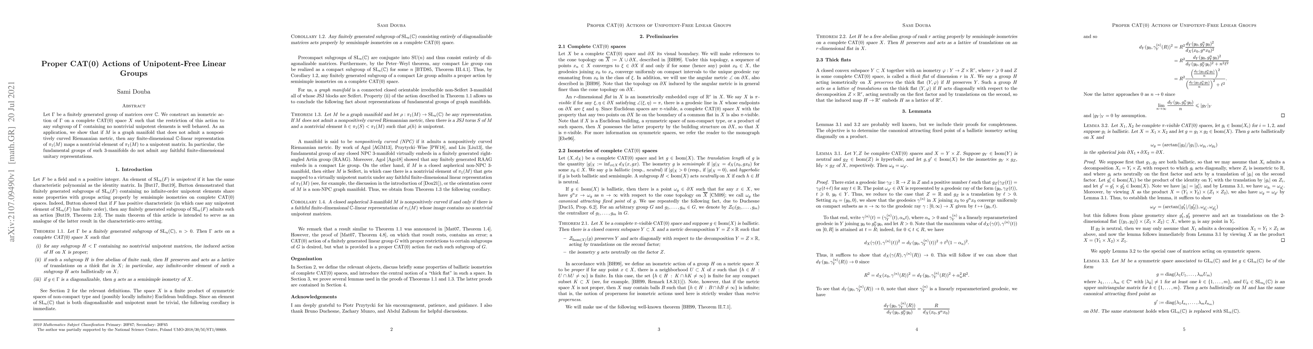Let $\Gamma$ be a finitely generated group of matrices over $\mathbb{C}$. We construct an isometric action of $\Gamma$ on a complete CAT(0) space $X$ such that the restriction of this action to any subgroup of $\Gamma$ containing no nontrivial unipotent elements is well behaved. As an application, we show that if $M$ is a graph manifold that does not admit a nonpositively curved Riemannian metric, then any finite-dimensional $\mathbb{C}$-linear representation of $\pi_1(M)$ maps a nontrivial element of $\pi_1(M)$ to a unipotent matrix. In particular, the fundamental groups of such 3-manifolds do not admit any faithful finite-dimensional unitary representations.