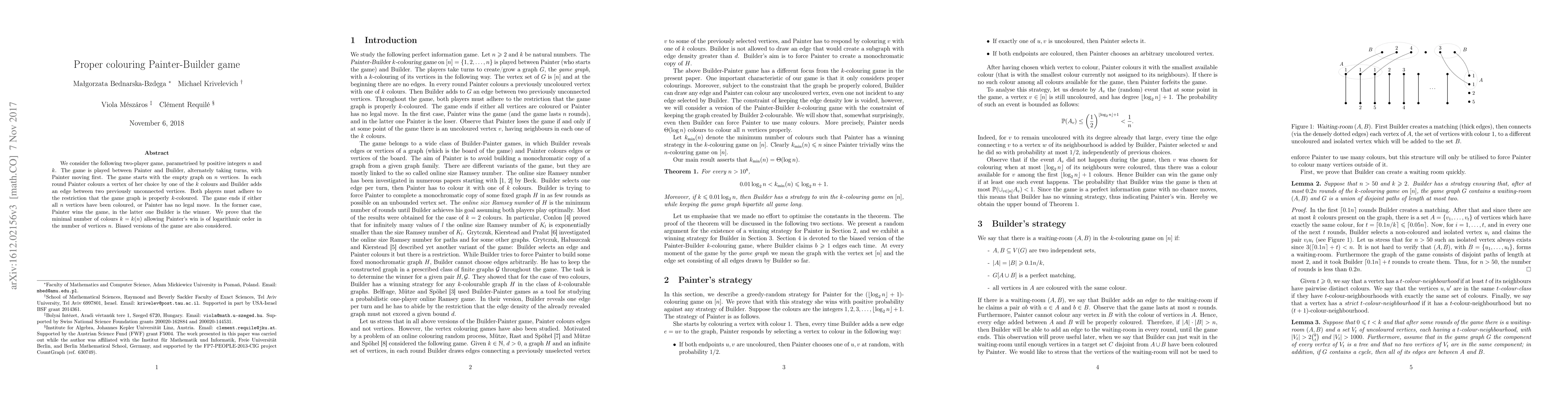 We consider the following two-player game, parametrised by positive integers $n$ and $k$. The game is played between Painter and Builder, alternately taking turns, with Painter moving first. The game starts with the empty graph on $n$ vertices. In each round Painter colours a vertex of her choice by one of the $k$ colours and Builder claims an edge between two previously unconnected vertices. Both players should maintain that during the game the graph admits a proper $k$-colouring. The game ends if either all $n$ vertices have been coloured, or Painter has no legal move. In the former case, Painter wins the game, in the latter one Builder is the winner. We prove that the minimal number of colours $k=k(n)$ allowing Painter's win is of logarithmic order in the number of vertices $n$. Biased versions of the game are also considered.