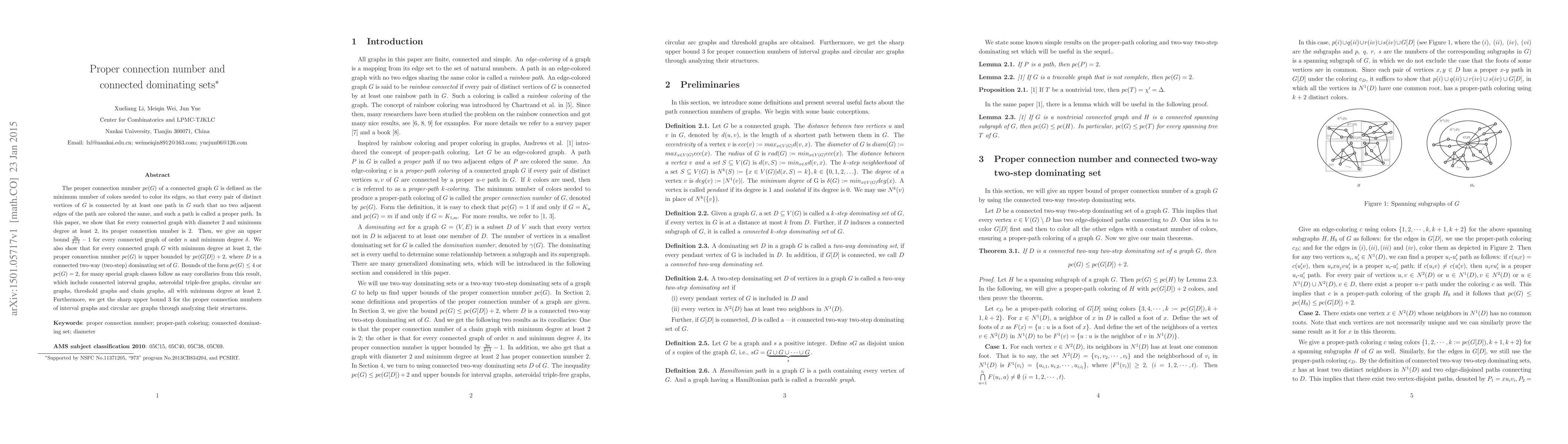 This paper investigates the proper connection number $pc(G)$ of connected graphs, defined as the minimum edge coloring required to ensure every pair of vertices is connected by a proper path. The authors prove that for graphs with diameter 2 and minimum degree at least 2, $pc(G)$ is 2, and provide an upper bound $\frac{3n}{\delta + 1}-1$ for general connected graphs. They also show that $pc(G)$ is upper bounded by $pc(G[D])+2$ for graphs with minimum degree at least 2, where $D$ is a connected two-way dominating set.