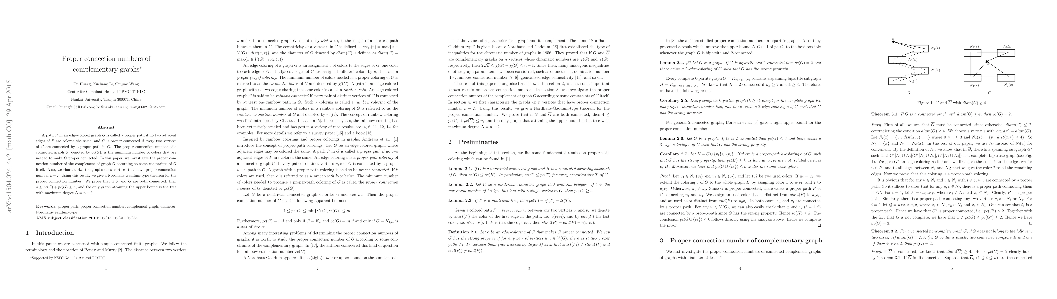 This paper investigates the proper connection number $pc(G)$ of a graph $G$, defined as the minimum colors needed to ensure every two vertices are connected by a proper path. It explores $pc(\overline{G})$ under various constraints and characterizes graphs with $pc(G) = n-2$, leading to a Nordhaus-Gaddum-type theorem for $pc(G)$ and $pc(\overline{G})$, showing $4\le pc(G)+pc(\overline{G})\le n$.