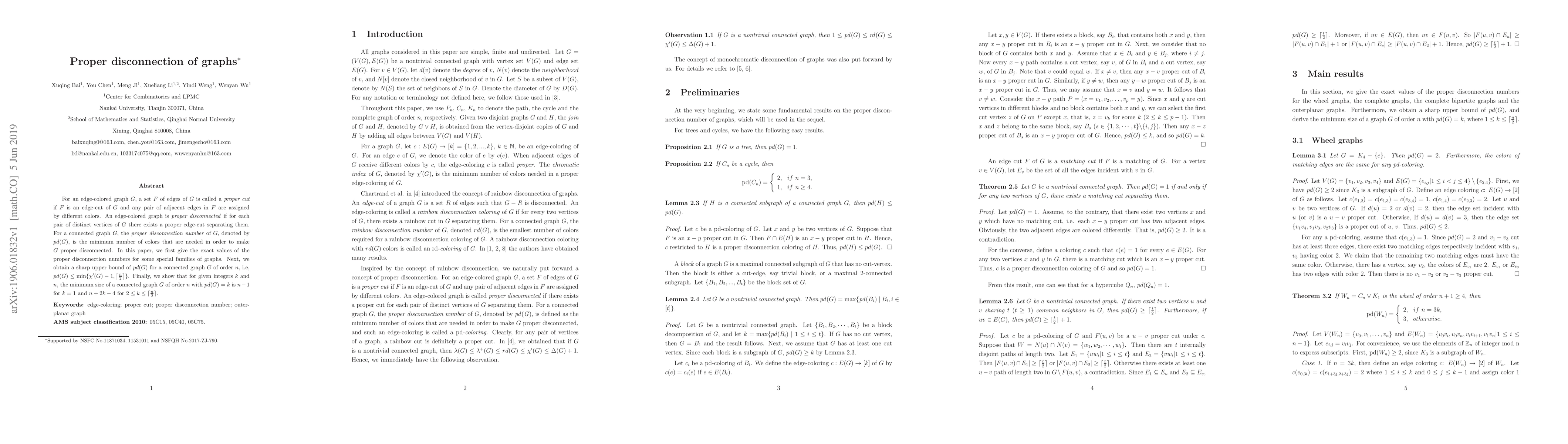 This paper investigates proper disconnection of graphs, a concept related to edge coloring, and establishes bounds for the minimum number of colors needed to disconnect a graph from each other, as well as the size of the smallest connected graphs with specific disconnection properties.