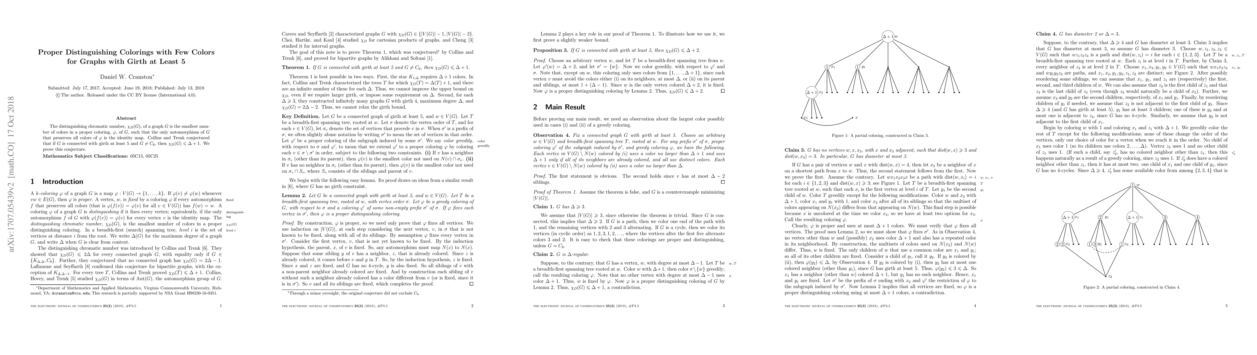 The distinguishing chromatic number, $\chi_D(G)$, of a graph $G$ is the smallest number of colors in a proper coloring, $\varphi$, of $G$, such that the only automorphism of $G$ that preserves all colors of $\varphi$ is the identity map. Collins and Trenk conjectured that if $G$ is connected with girth at least 5 and $G\ne C_6$, then $\chi_D(G)\le \Delta+1$. We prove this conjecture.