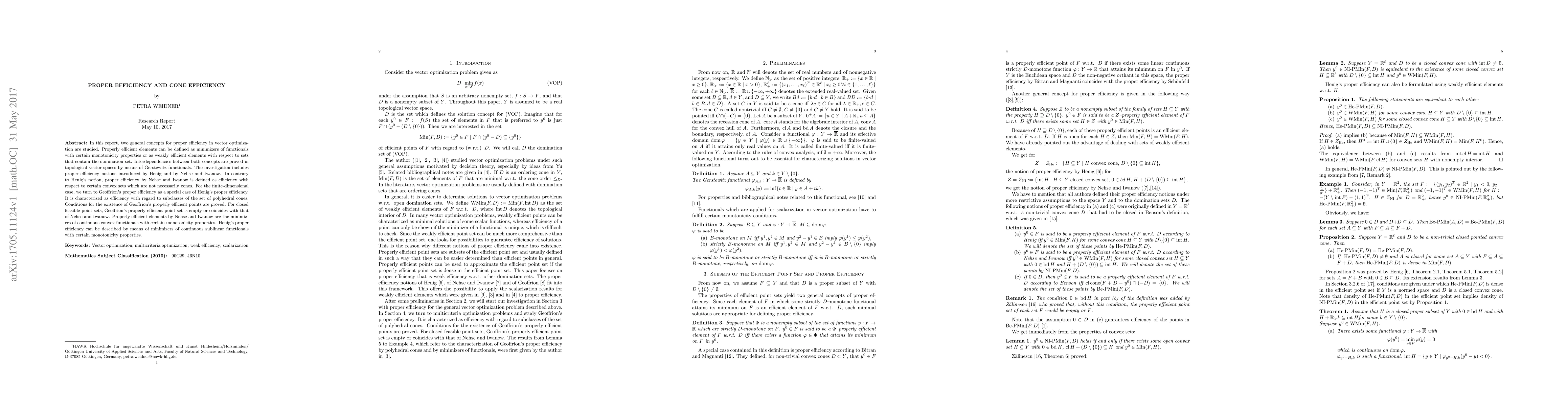 In this report, two general concepts for proper efficiency in vector optimization are studied. Properly efficient elements can be defined as minimizers of functionals with certain monotonicity properties or as weakly efficient elements with respect to sets that contain the domination set. Interdependencies between both concepts are proved in topological vector spaces by means of Gerstewitz functionals. The investigation includes proper efficiency notions introduced by Henig and by Nehse and Iwanow. In contrary to Henig's notion, proper efficiency by Nehse and Iwanow is defined as efficiency with respect to certain convex sets which are not necessarily cones. For the finite-dimensional case, we turn to Geoffrion's proper efficiency as a special case of Henig's proper efficiency. It is characterized as efficiency with regard to subclasses of the set of polyhedral cones. Conditions for the existence of Geoffrion's properly efficient points are proved. For closed feasible point sets, Geoffrion's properly efficient point set is empty or coincides with that of Nehse and Iwanow. Properly efficient elements by Nehse and Iwanow are the minimizers of continuous convex functionals with certain monotonicity properties. Henig's proper efficiency can be described by means of minimizers of continuous sublinear functionals with certain monotonicity properties.