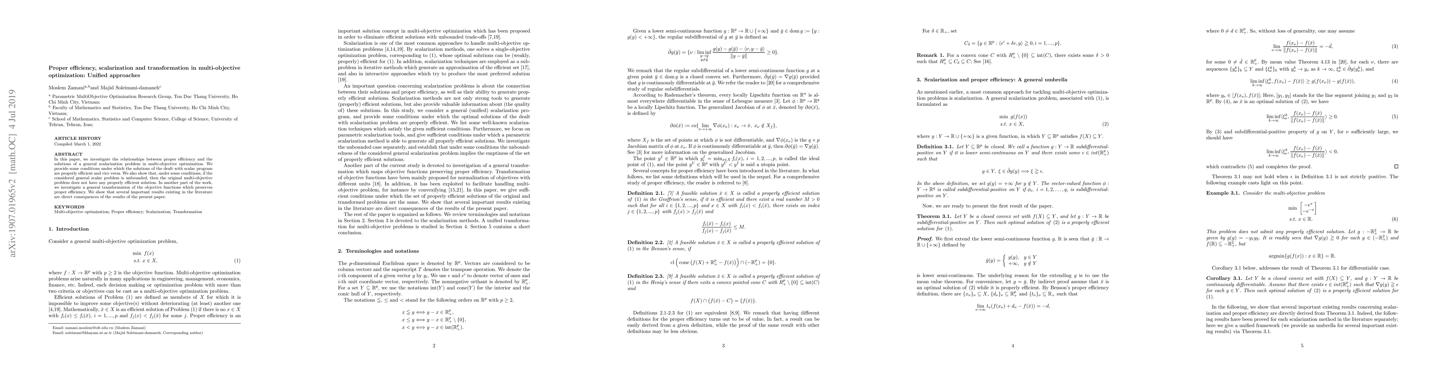 In this paper, we investigate the relationships between proper efficiency and the solutions of a general scalarization problem in multi-objective optimization. We provide some conditions under which the solutions of the dealt with scalar program are properly efficient and vice versa. We also show that, under some conditions, if the considered general scalar problem is unbounded, then the original multi-objective problem does not have any properly efficient solution. In another part of the work, we investigate a general transformation of the objective functions which preserves proper efficiency. We show that several important results existing in the literature are direct consequences of the results of the present paper.