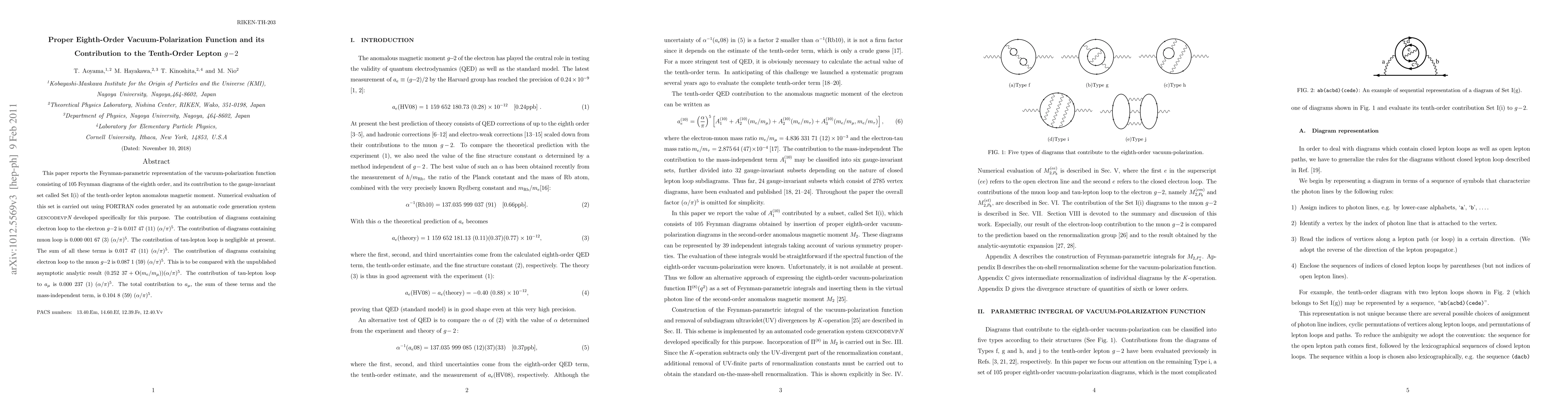 This paper presents the eighth-order vacuum-polarization function, represented by 105 Feynman diagrams, and evaluates its contribution to the tenth-order lepton anomalous magnetic moment, specifically to the gauge-invariant Set I(i). The electron loop contributes 0.017 47 (11) (alpha/pi)^5 to the electron g-2, while the muon loop contributes 0.000 001 67 (3) (alpha/pi)^5, with the tau-lepton loop's contribution being negligible.