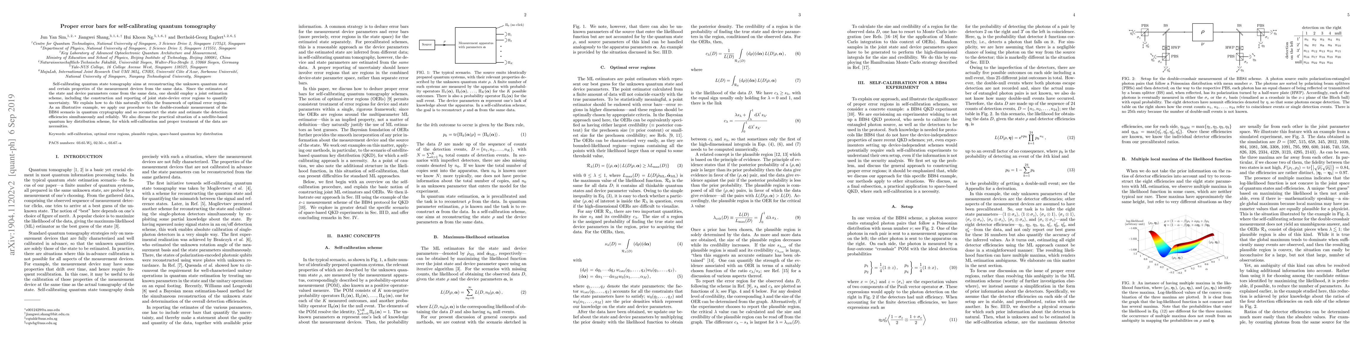 This paper outlines a method for constructing joint error regions in self-calibrating quantum tomography to quantify uncertainties in both the quantum state and device parameters. It demonstrates the approach using the BB84 quantum cryptography scenario and highlights its importance in satellite-based quantum key distribution.