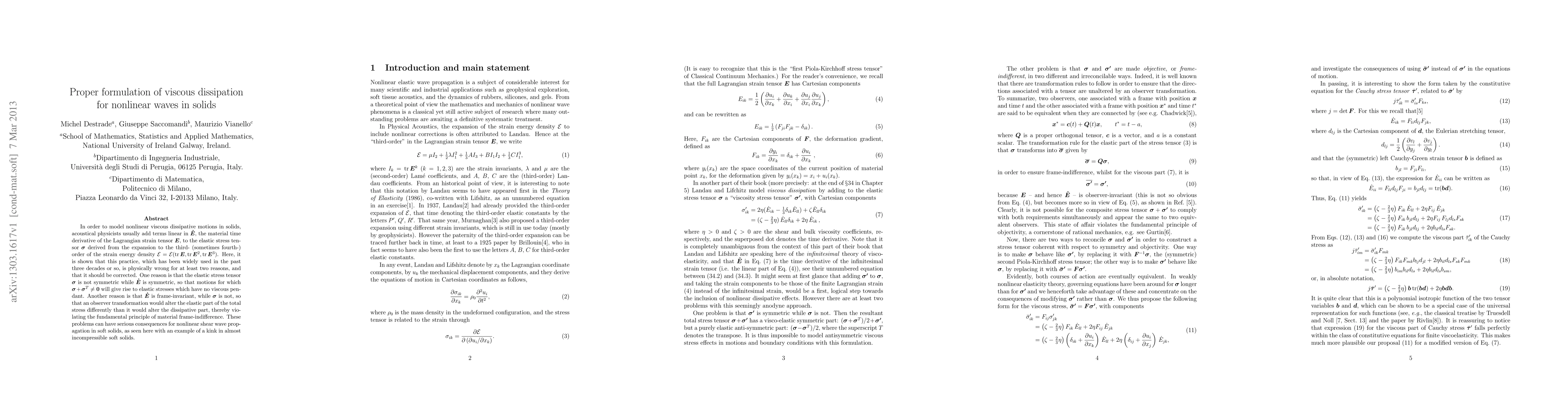 In order to model nonlinear viscous dissipative motions in solids, acoustical physicists usually add terms linear in dot{E}, the material time derivative of the Lagrangian strain tensor E, to the elastic stress tensor sigma derived from the expansion to the third- (sometimes fourth-) order of the strain energy density e=e(trace(E), trace(E^2), trace(E^3)). Here, it is shown that this practice, which has been widely used in the past three decades or so, is physically wrong for at least two reasons, and that it should be corrected. One reason is that the elastic stress tensor sigma is not symmetric while dot{E) is symmetric, so that motions for which sigma + sigma^T <> 0 will give rise to elastic stresses which have no viscous pendant. Another reason is that dot{E} is frame-invariant, while sigma is not, so that an observer transformation would alter the elastic part of the total stress differently than it would alter the dissipative part, thereby violating the fundamental principle of material frame-indifference. These problems can have serious consequences for nonlinear shear wave propagation in soft solids, as seen here with an example of a kink in almost incompressible soft solids.