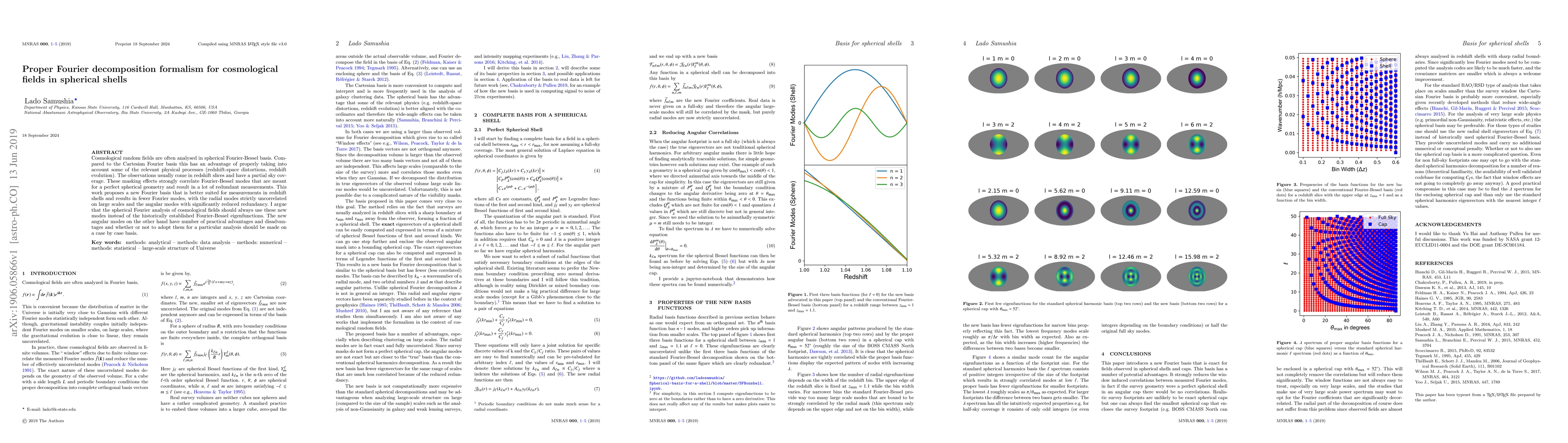 Cosmological random fields are often analysed in spherical Fourier-Bessel basis. Compared to the Cartesian Fourier basis this has an advantage of properly taking into account some of the relevant physical processes (redshift-space distortions, redshift evolution). The observations usually come in redshift slices and have a partial sky coverage. These masking effects strongly correlate Fourier-Bessel modes that are meant for a perfect spherical geometry and result in a lot of redundant measurements. This work proposes a new Fourier basis that is better suited for measurements in redshift shells and results in fewer Fourier modes, with the radial modes strictly uncorrelated on large scales and the angular modes with significantly reduced redundancy. I argue that the spherical Fourier analysis of cosmological fields should always use these new modes instead of the historically established Fourier-Bessel eigenfunctions. The new angular modes on the other hand have number of practical advantages and disadvantages and whether or not to adopt them for a particular analysis should be made on a case by case basis.