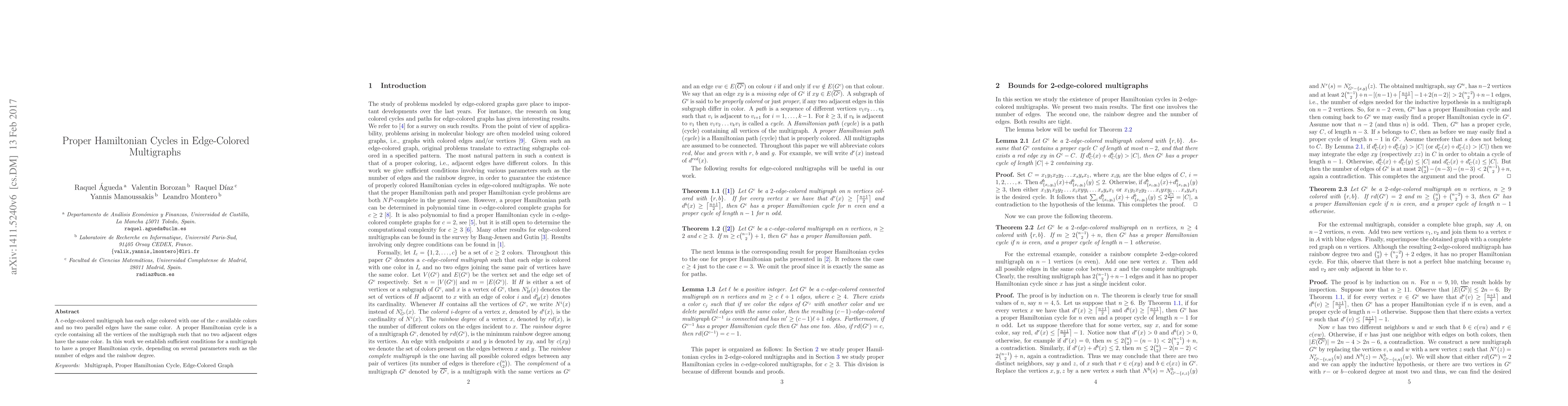A $c$-edge-colored multigraph has each edge colored with one of the $c$ available colors and no two parallel edges have the same color. A proper Hamiltonian cycle is a cycle containing all the vertices of the multigraph such that no two adjacent edges have the same color. In this work we establish sufficient conditions for a multigraph to have a proper Hamiltonian cycle, depending on several parameters such as the number of edges and the rainbow degree.