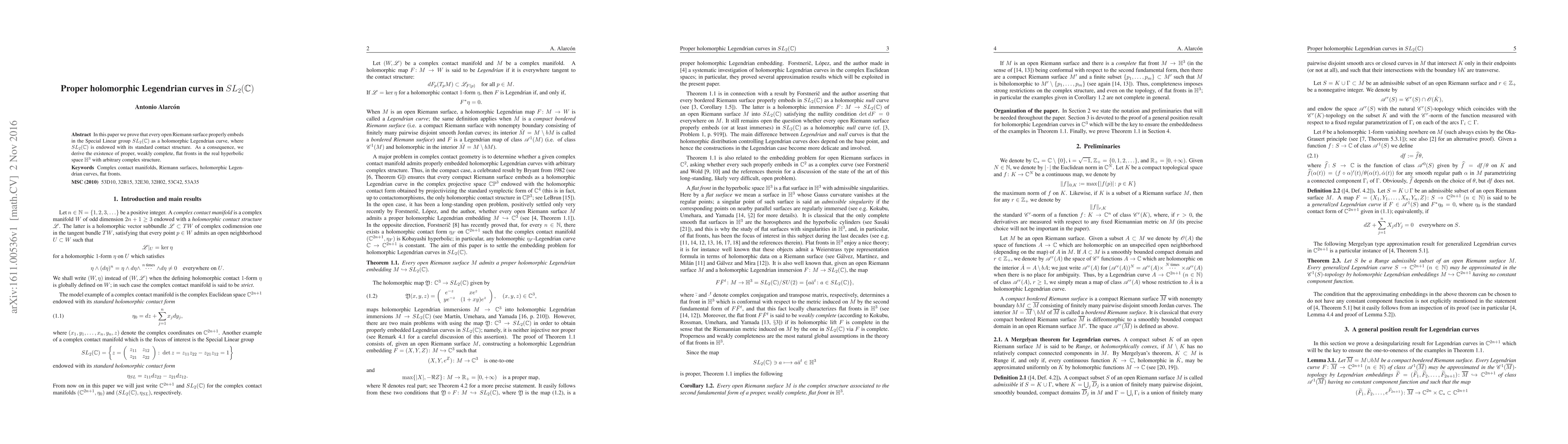 In this paper we prove that every open Riemann surface properly embeds in the Special Linear group $SL_2(\mathbb{C})$ as a holomorphic Legendrian curve, where $SL_2(\mathbb{C})$ is endowed with its standard contact structure. As a consequence, we derive the existence of proper, weakly complete, flat fronts in the real hyperbolic space $\mathbb{H}^3$ with arbitrary complex structure.