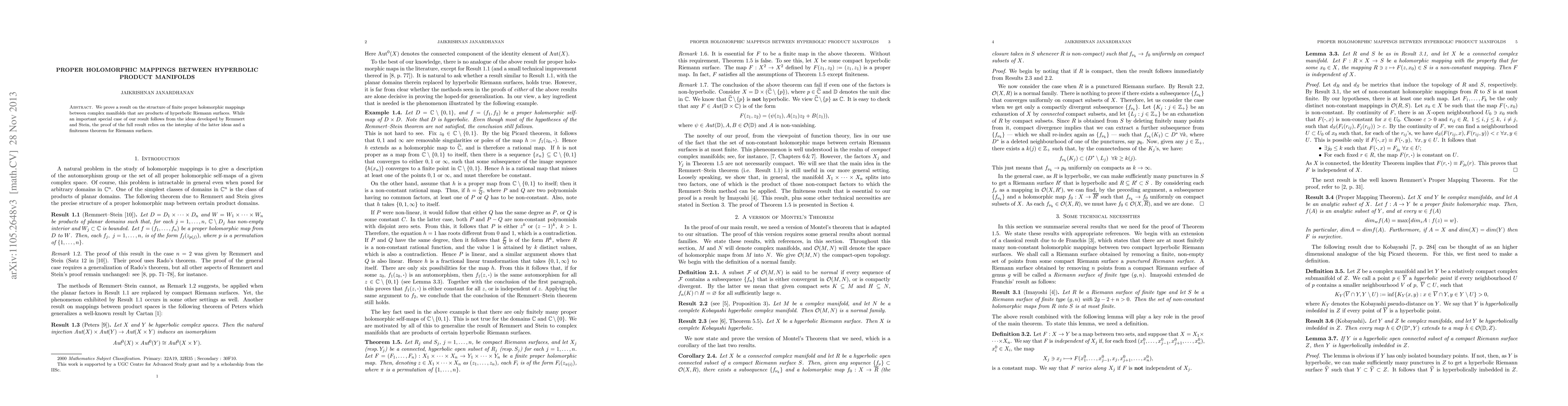 This paper proves the structure of finite proper holomorphic mappings between hyperbolic product manifolds, combining Remmert and Stein's ideas with a finiteness theorem for Riemann surfaces to achieve the result.