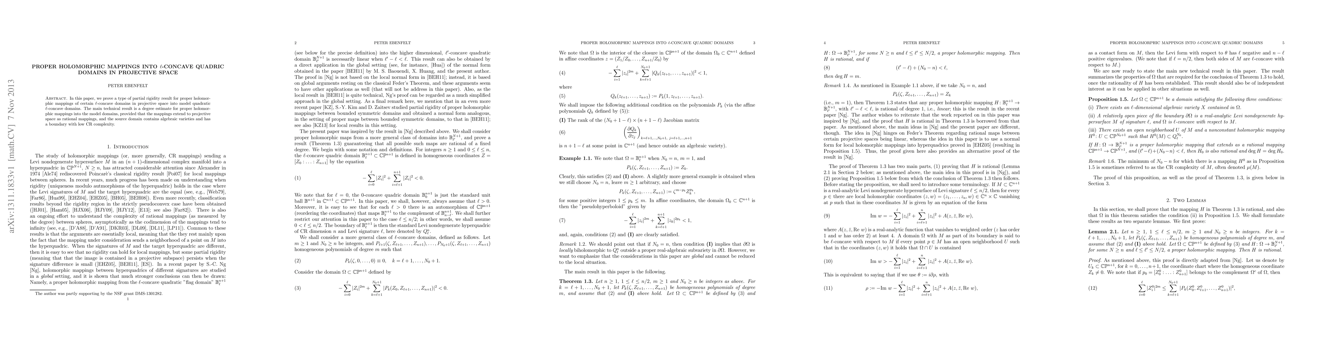 Summary: This paper establishes a partial rigidity result for proper holomorphic mappings from specific $\ell$-concave domains in projective space to model quadratic $\ell$-concave domains, with a degree estimate for mappings extending to rational mappings and under conditions of low CR complexity on the source domain's boundary.