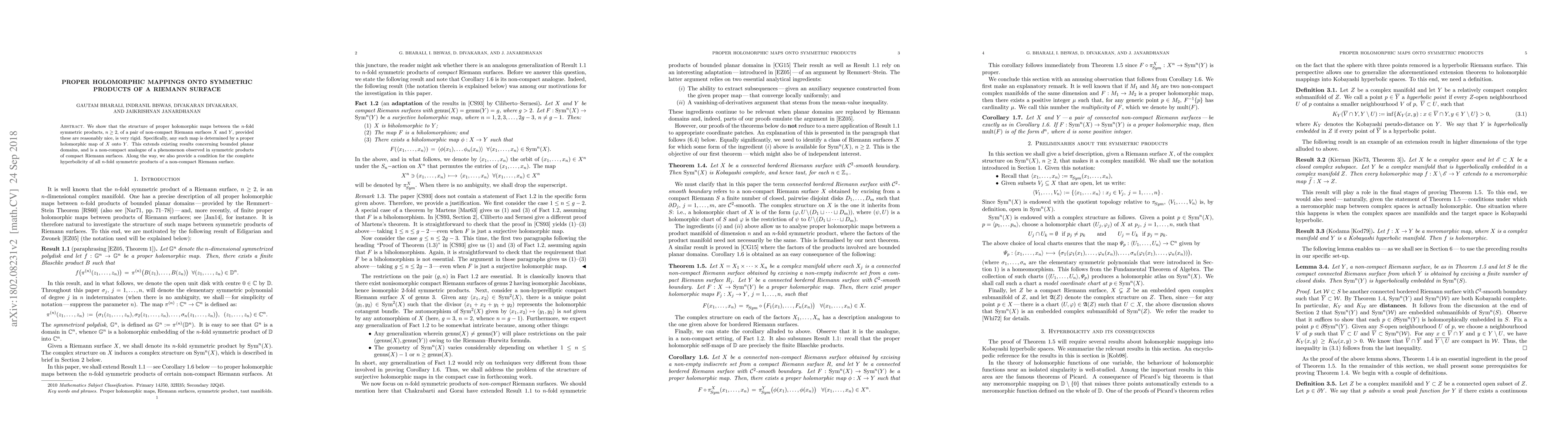 This paper demonstrates that proper holomorphic maps between $n$-fold symmetric products of non-compact Riemann surfaces are rigid and determined by proper holomorphic maps between the original surfaces. It extends previous results for bounded planar domains and provides a condition for the complete hyperbolicity of these symmetric products.