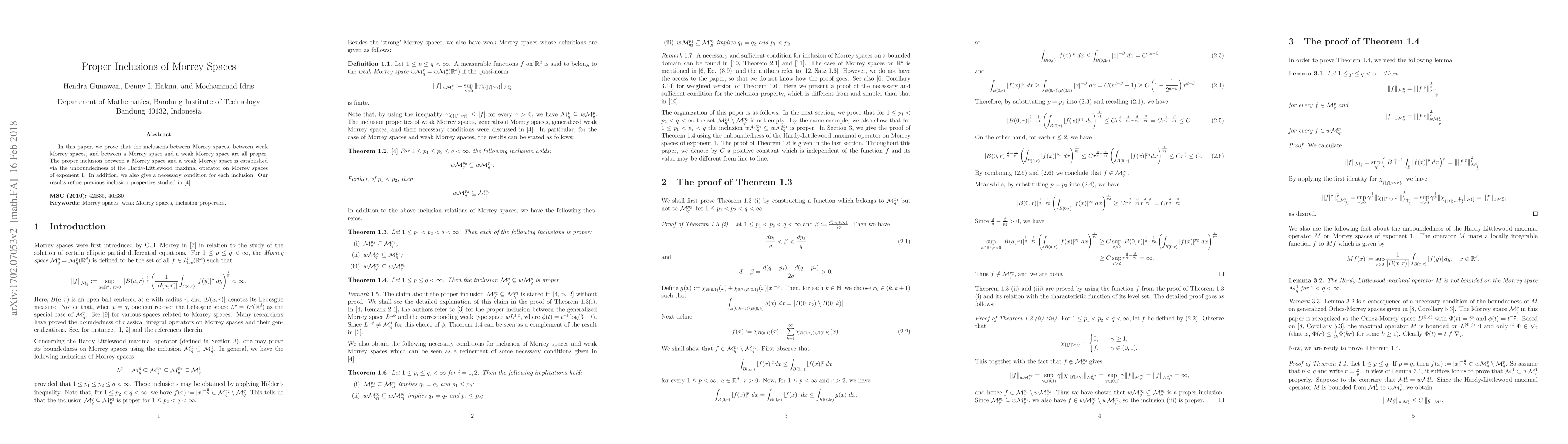 This paper demonstrates that inclusions between Morrey spaces, weak Morrey spaces, and between a Morrey space and a weak Morrey space are all proper, with the latter proven through the unboundedness of the Hardy-Littlewood maximal operator on Morrey spaces of exponent 1. It also provides a necessary condition for each inclusion, refining previous results.