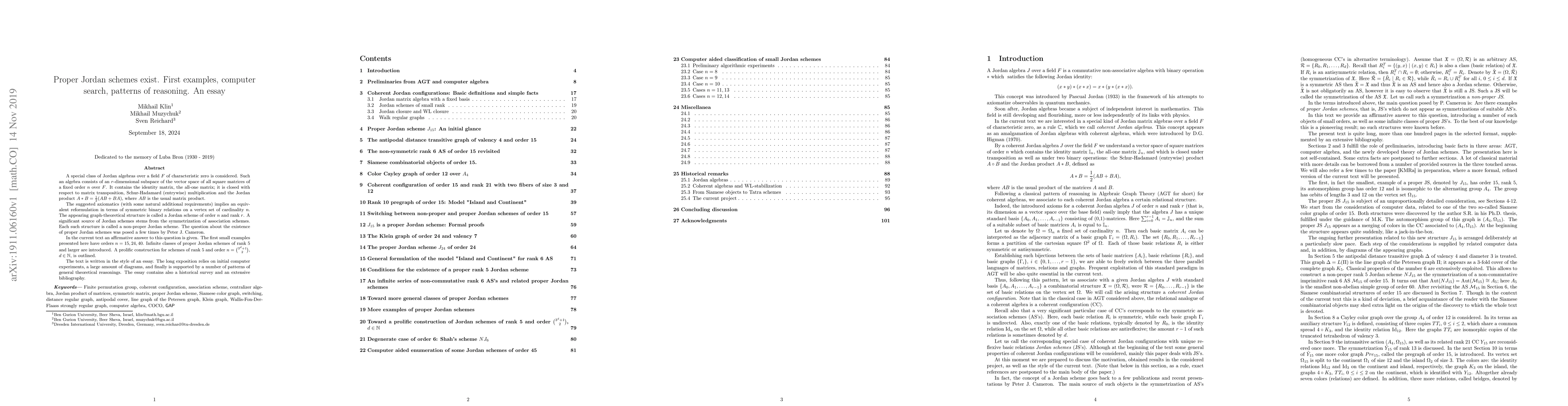 A special class of Jordan algebras over a field $F$ of characteristic zero is considered. Such an algebra consists of an $r$-dimensional subspace of the vector space of all square matrices of a fixed order $n$ over $F$. It contains the identity matrix, the all-one matrix; it is closed with respect to \correction{matrix transposition}, Schur-Hadamard (entrywise) multiplication and the Jordan product $A*B=\frac 12 (AB+BA)$, where $AB$ is the usual matrix product. The suggested axiomatics (with some natural additional requirements) implies an equivalent reformulation in terms of symmetric binary relations on a vertex set of cardinality $n$. The appearing graph-theoretical structure is called a Jordan scheme of order $n$ and rank $r$. A significant source of Jordan schemes stems from the symmetrization of association schemes. Each such structure is called a non-proper Jordan scheme. The question about the existence of proper Jordan schemes was posed a few times by Peter J. Cameron. In the current text an affirmative answer to this question is given. The first small examples presented here have orders $n=15,24,40$. Infinite classes of proper Jordan schemes of rank 5 and larger are introduced. A prolific construction for schemes of rank 5 and order $n=\binom{3^d+1}{2}$, $d\in {\mathbb N}$, is outlined. The text is written in the style of an essay. The long exposition relies on initial computer experiments, a large amount of diagrams, and finally is supported by a number of patterns of general theoretical reasonings. The essay contains also a historical survey and an extensive bibliography.