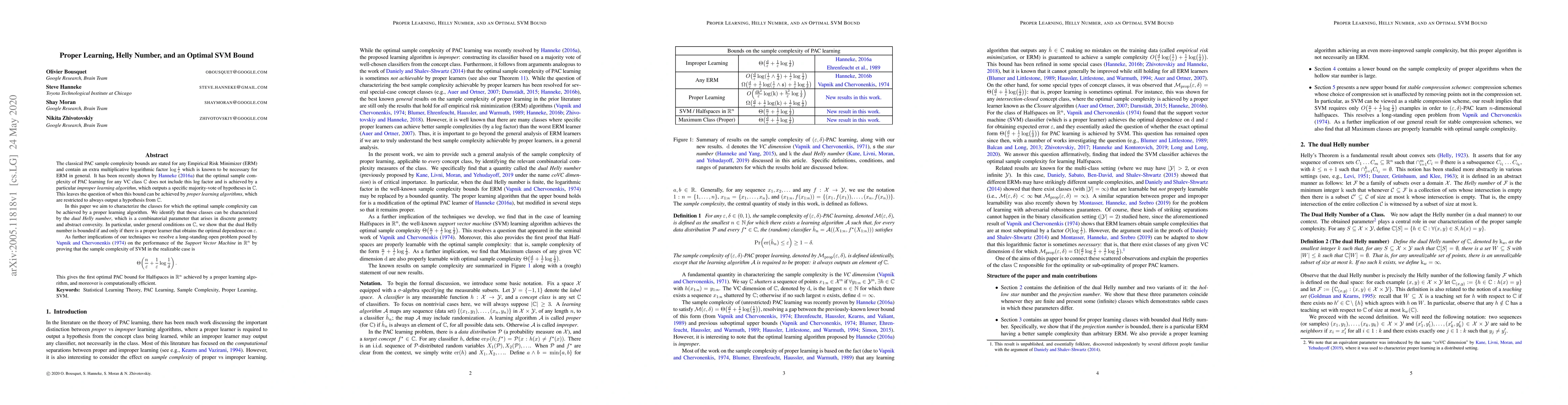 The classical PAC sample complexity bounds are stated for any Empirical Risk Minimizer (ERM) and contain an extra logarithmic factor $\log(1/{\epsilon})$ which is known to be necessary for ERM in general. It has been recently shown by Hanneke (2016) that the optimal sample complexity of PAC learning for any VC class C is achieved by a particular improper learning algorithm, which outputs a specific majority-vote of hypotheses in C. This leaves the question of when this bound can be achieved by proper learning algorithms, which are restricted to always output a hypothesis from C. In this paper we aim to characterize the classes for which the optimal sample complexity can be achieved by a proper learning algorithm. We identify that these classes can be characterized by the dual Helly number, which is a combinatorial parameter that arises in discrete geometry and abstract convexity. In particular, under general conditions on C, we show that the dual Helly number is bounded if and only if there is a proper learner that obtains the optimal joint dependence on $\epsilon$ and $\delta$. As further implications of our techniques we resolve a long-standing open problem posed by Vapnik and Chervonenkis (1974) on the performance of the Support Vector Machine by proving that the sample complexity of SVM in the realizable case is $\Theta((n/{\epsilon})+(1/{\epsilon})\log(1/{\delta}))$, where $n$ is the dimension. This gives the first optimal PAC bound for Halfspaces achieved by a proper learning algorithm, and moreover is computationally efficient.