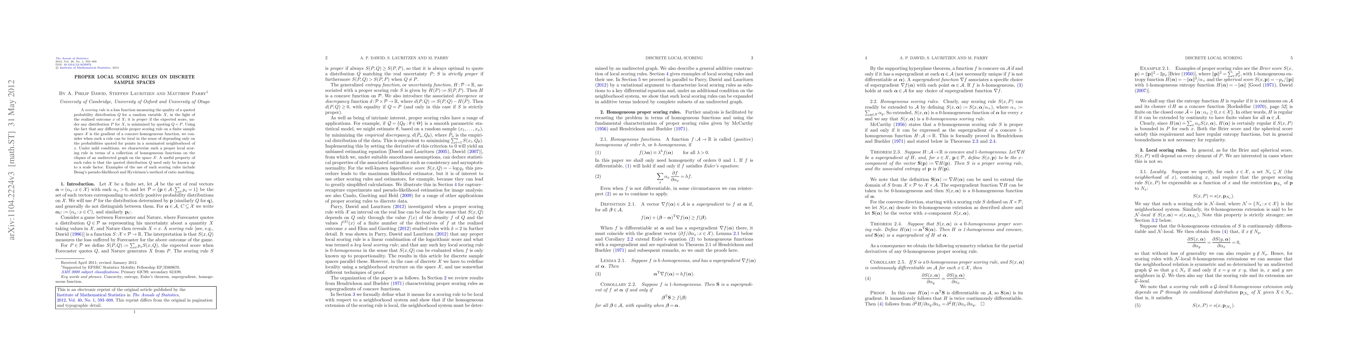 This paper explores proper local scoring rules on discrete sample spaces, demonstrating that such rules can be characterized by a collection of homogeneous functions on the cliques of a graph representing the sample space. The study highlights that these rules require the quoted distribution only up to a scale factor, with applications including Besag's pseudo-likelihood and Hyvärinen's method of ratio matching.