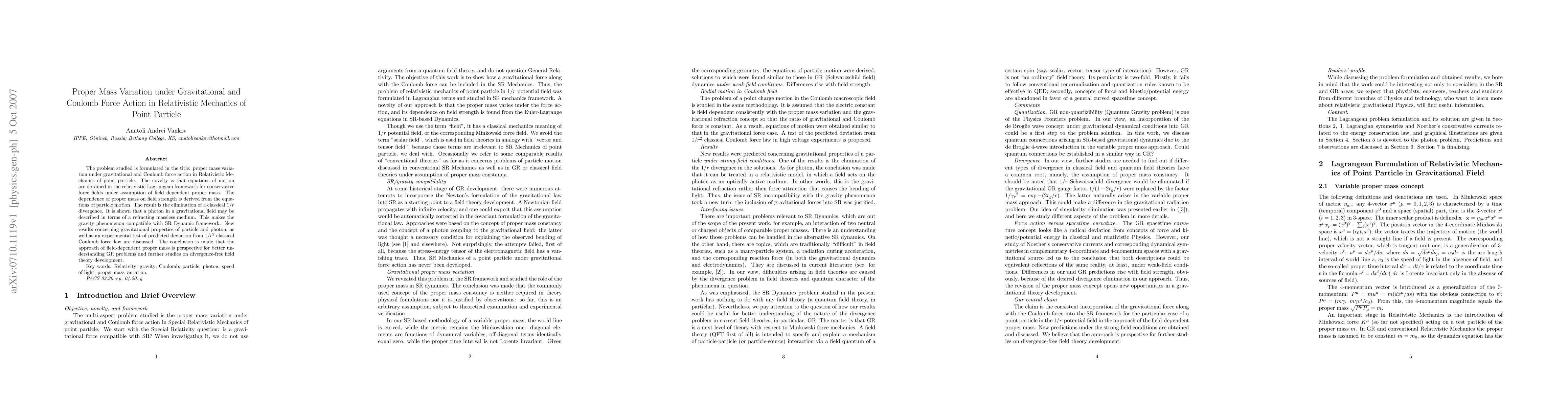 The problem studied is formulated in the title: proper mass variation under gravitational and Coulomb force action in Relativistic Mechanics of point particle. The novelty is that equations of motion are obtained in the relativistic Lagrangean framework for conservative force fields under assumption of field dependent proper mass. The dependence of proper mass on field strength is derived from the equations of particle motion. The result is the elimination of a classical 1/r divergence. It is shown that a photon in a gravitational field may be described in terms of a refracting massless medium. This makes the gravity phenomenon compatible with SR Dynamic framework. New results concerning gravitational properties of particle and photon, as well as an experimental test of predicted deviation from 1/r^2 classical Coulomb force law are discussed. The conclusion is made that the approach of field-dependent proper mass is perspective for better understanding GR problems and further studies on divergence-free field theory development. Key words: Relativity; gravity; Coulomb; particle; photon; speed of light; proper mass variation. PACS: 03.30.+p, 04.20.-g