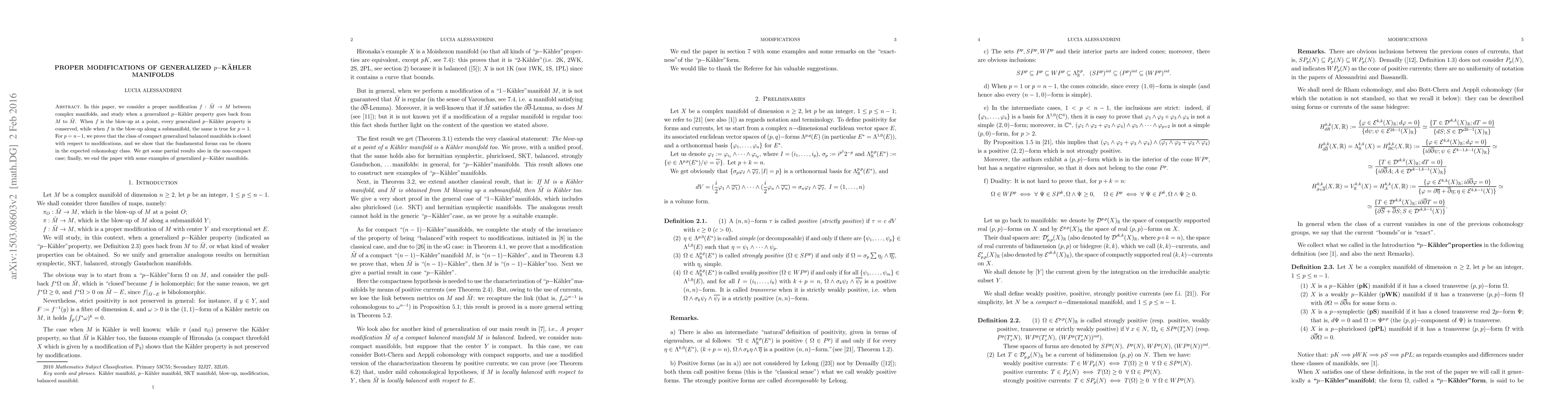 In this paper, we consider a proper modification $f : \tilde M \to M$ between complex manifolds, and study when a generalized $p-$K\"ahler property goes back from $M$ to $\tilde M$. When $f$ is the blow-up at a point, every generalized $p-$K\"ahler property is conserved, while when $f$ is the blow-up along a submanifold, the same is true for $p=1$. For $p=n-1$, we prove that the class of compact generalized balanced manifolds is closed with respect to modifications, and we show that the fundamental forms can be chosen in the expected cohomology class. We get some partial results also in the non-compact case; finally, we end the paper with some examples of generalized $p-$K\"ahler manifolds.