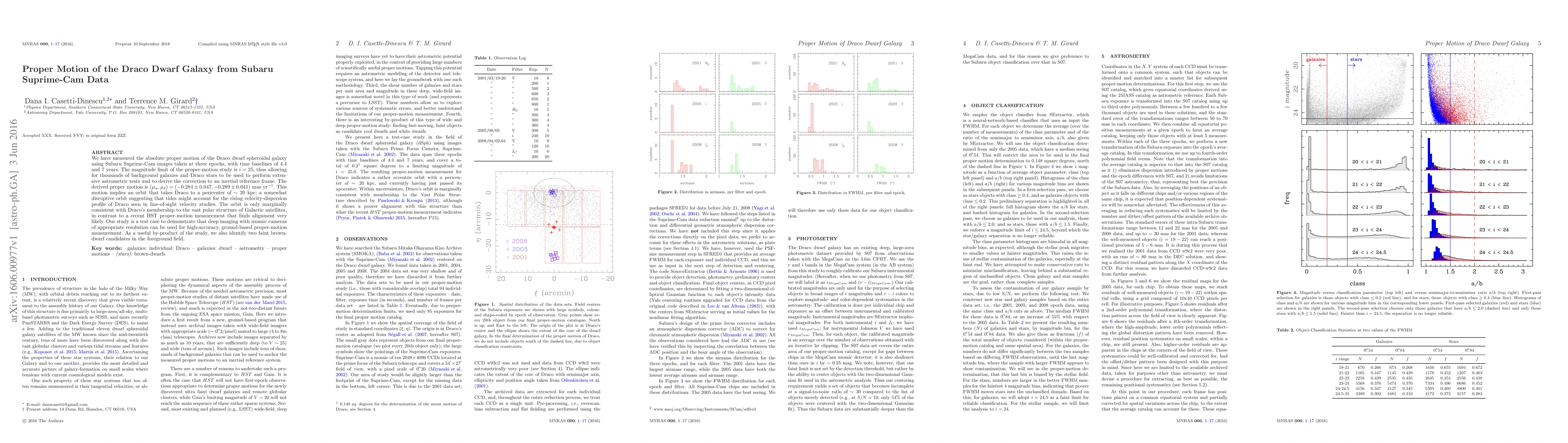 This study measures the proper motion of the Draco dwarf galaxy using Subaru Suprime-Cam data, finding it to be (-0.284 ± 0.047, -0.289 ± 0.041) mas/yr, suggesting a disruptive orbit inconsistent with its alignment with the vast polar structure of Galactic satellites. The research also identifies two faint brown-dwarf candidates.