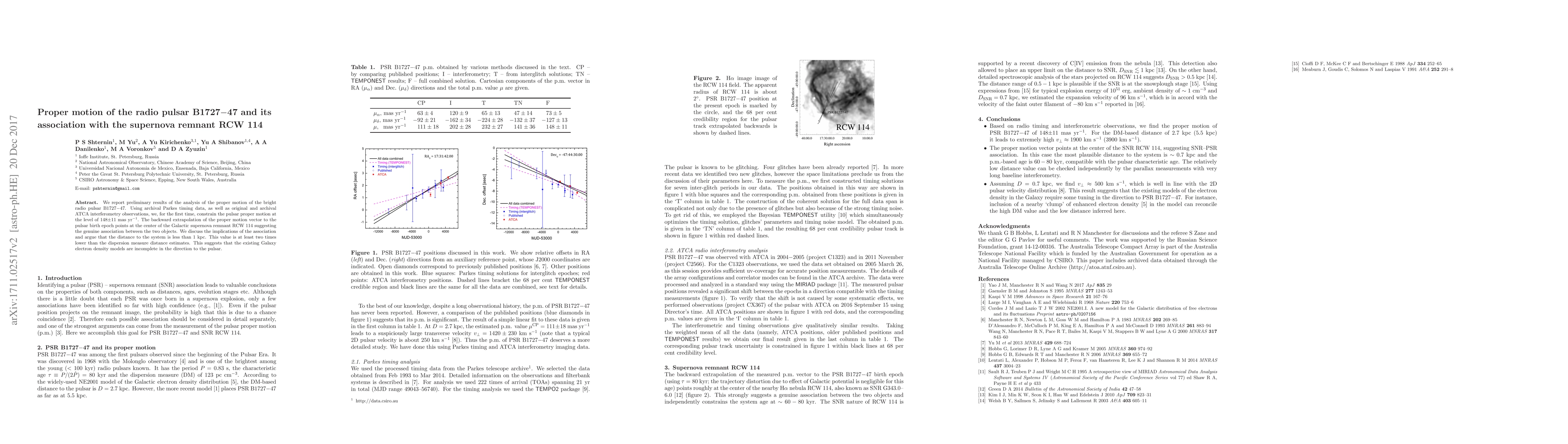 We report preliminary results of the analysis of the proper motion of the bright radio pulsar B1727$-$47. Using archival Parkes timing data, as well as original and archival ATCA interferometry observations, we, for the first time, constrain the pulsar proper motion at the level of 148$\pm$11 mas yr$^{-1}$. The backward extrapolation of the proper motion vector to the pulsar birth epoch points at the center of the Galactic supernova remnant RCW 114 suggesting the genuine association between the two objects. We discuss the implications of the association and argue that the distance to the system is less than $1$ kpc. This value is at least two times lower than the dispersion measure distance estimates. This suggests that the existing Galaxy electron density models are incomplete in the direction to the pulsar.