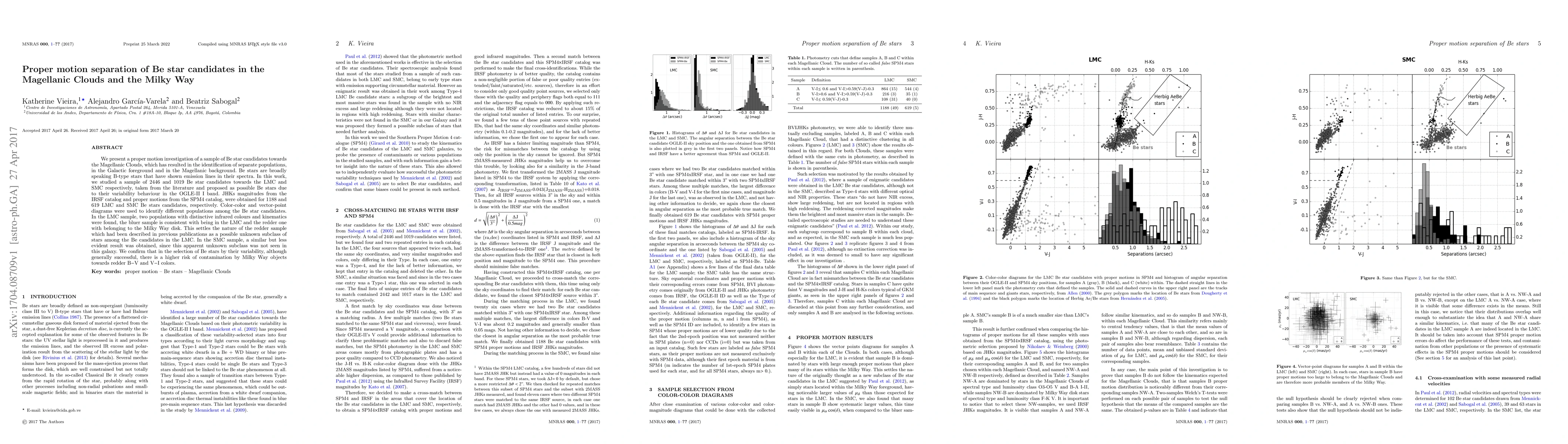 This study investigates the proper motions of Be star candidates in the Magellanic Clouds and Milky Way, identifying distinct populations. The analysis reveals two populations in the Large Magellanic Cloud (LMC), with one consistent with the LMC and the other likely belonging to the Milky Way disk, resolving previous uncertainties. In the Small Magellanic Cloud (SMC), a similar but less clear distinction was found. The research highlights the risk of Milky Way contamination in Be star selections based on variability.