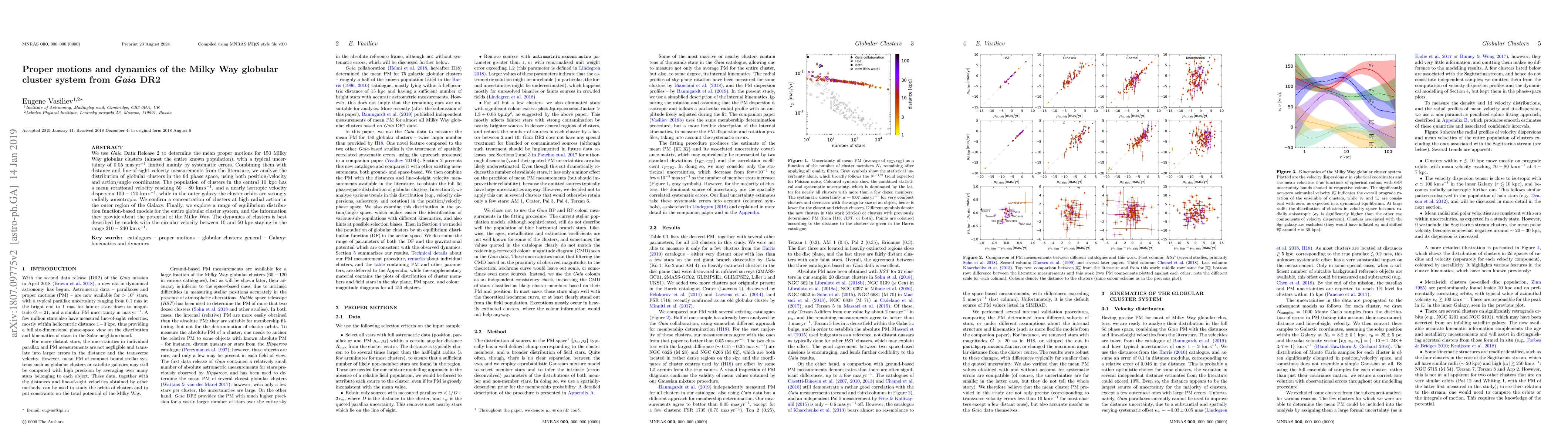 Gaia DR2 provides mean proper motions for nearly all Milky Way globular clusters, revealing a central population with rotational velocities of 50-80 km/s and isotropic dispersions of 100-120 km/s, while outer clusters exhibit radially anisotropic orbits. Models suggest a circular velocity of 210-240 km/s for the Milky Way's potential.