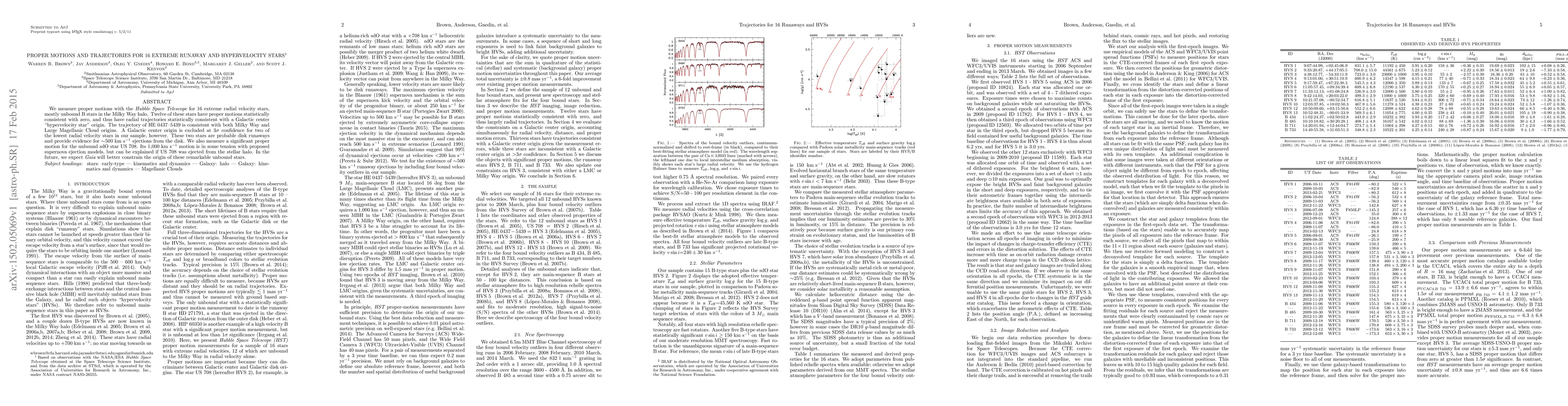 We measure proper motions with the Hubble Space Telescope for 16 extreme radial velocity stars, mostly unbound B stars in the Milky Way halo. Twelve of these stars have proper motions statistically consistent with zero, and thus have radial trajectories statistically consistent with a Galactic center "hypervelocity star" origin. The trajectory of HE 0437-5439 is consistent with both Milky Way and Large Magellanic Cloud origins. A Galactic center origin is excluded at 3-sigma confidence for two of the lowest radial velocity stars in our sample, however. These two stars are probable disk runaways and provide evidence for ~500 km/s ejections from the disk. We also measure a significant proper motion for the unbound sdO star US 708. Its 1,000 km/s motion is in some tension with proposed supernova ejection models, but can be explained if US 708 was ejected from the stellar halo. In the future, we expect Gaia will better constrain the origin of these remarkable unbound stars.