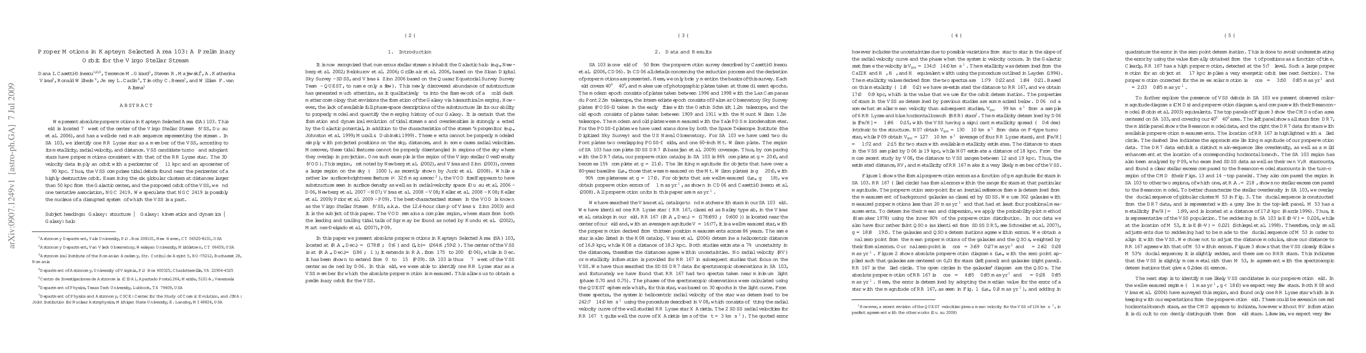 We present absolute proper motions in Kapteyn Selected Area (SA) 103. This field is located 7 degrees west of the center of the Virgo Stellar Stream (VSS, Duffau et al. 2006), and has a well-defined main sequence representing the stream. In SA 103 we identify one RR Lyrae star as a member of the VSS according to its metallicity, radial velocity and distance. VSS candidate turnoff stars and subgiant stars have proper motions consistent with that of the RR Lyrae star. The 3D velocity data imply an orbit with a pericenter of 11 kpc and an apocenter of ~90 kpc. Thus, the VSS comprises tidal debris found near the pericenter of a highly destructive orbit. Examining the six globular clusters at distances larger than 50 kpc from the Galactic center, and the proposed orbit of the VSS, we find one tentative association, NGC 2419. We speculate that NGC 2419 is possibly the nucleus of a disrupted system of which the VSS is a part.