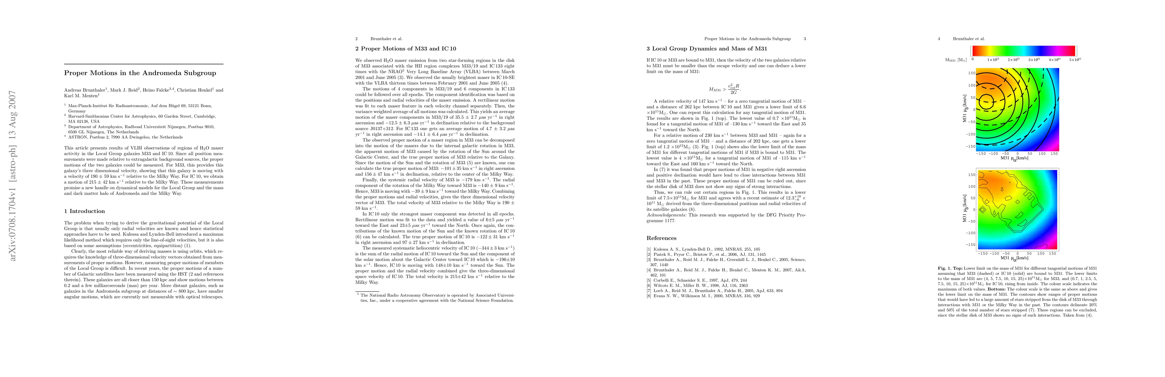 This article presents results of VLBI observations of regions of H2O maser activity in the Local Group galaxies M33 and IC10. Since all position measurements were made relative to extragalactic background sources, the proper motions of the two galaxies could be measured. For M33, this provides this galaxy's three dimensional velocity, showing that this galaxy is moving with a velocity of 190 +/- 59 km\s relative to the Milky Way. For IC10, we obtain a motion of 215 +/- 42 km/s relative to the Milky Way. These measurements promise a new handle on dynamical models for the Local Group and the mass and dark matter halo of Andromeda and the Milky Way.