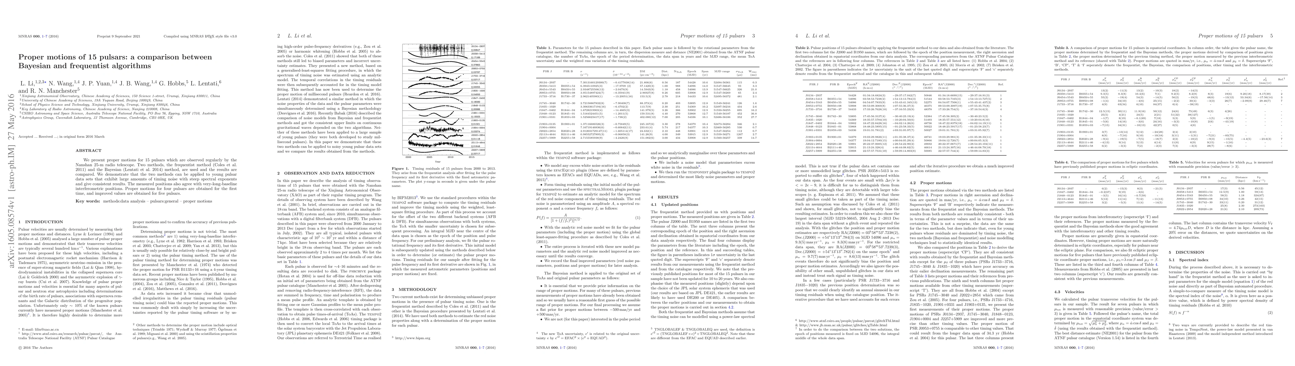 We present proper motions for 15 pulsars which are observed regularly by the Nanshan 25-m radio telescope. Two methods, the frequentist method (Coles et al.2011) and the Bayesian (Lentati et al. 2014) method, are used and the results are compared. We demonstrate that the two methods can be applied to young pulsar data sets that exhibit large amounts of timing noise with steep spectral exponents and give consistent results. The measured positions also agree with very-long-baseline interferometric positions. Proper motions for four pulsars are obtained for the first time, and improved values are obtained for five pulsars.