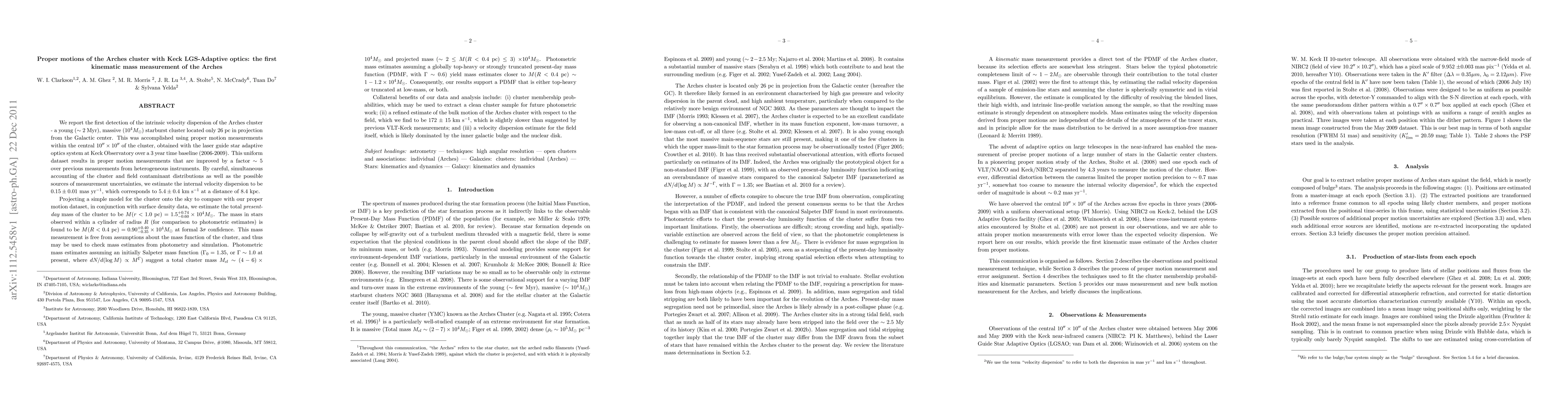 Researchers used Keck Observatory's adaptive optics to measure the velocity dispersion of the Arches cluster, a young starburst cluster near the Galactic center, for the first time, finding it to be 0.15 +/-.01 mas/yr, corresponding to 5.4 +/- 0.4 km/s.