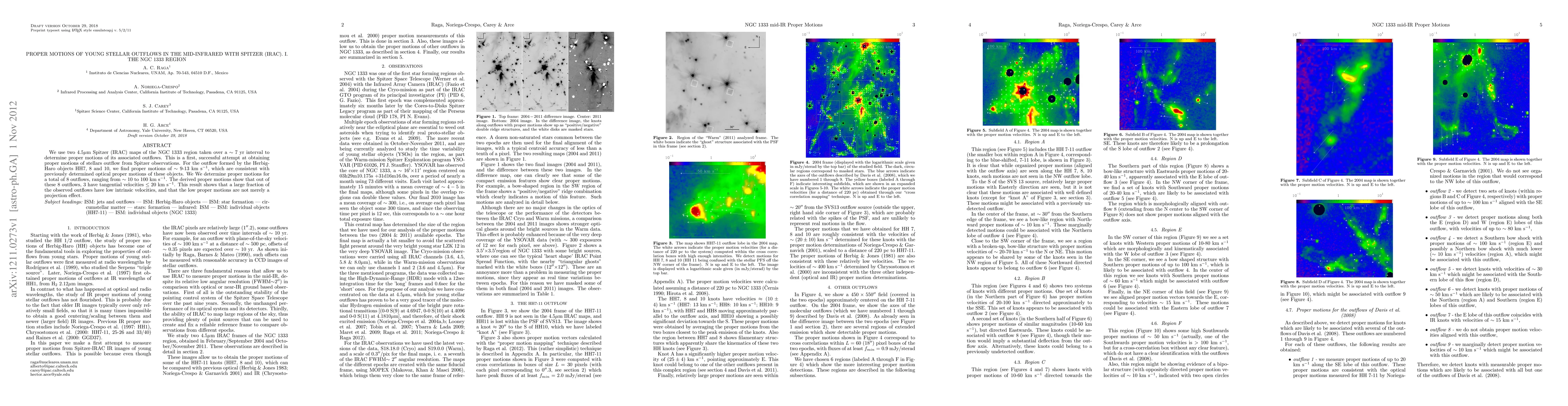 This study uses Spitzer (IRAC) observations to successfully measure proper motions of young stellar outflows in the NGC 1333 region for the first time. Proper motions for 8 outflows, ranging from 10 to 100 km/s, were determined. Notably, 3 outflows exhibit tangential velocities less than or equal to 20 km/s, indicating that a significant fraction of observed outflows have low intrinsic velocities, contrary to projection effects.