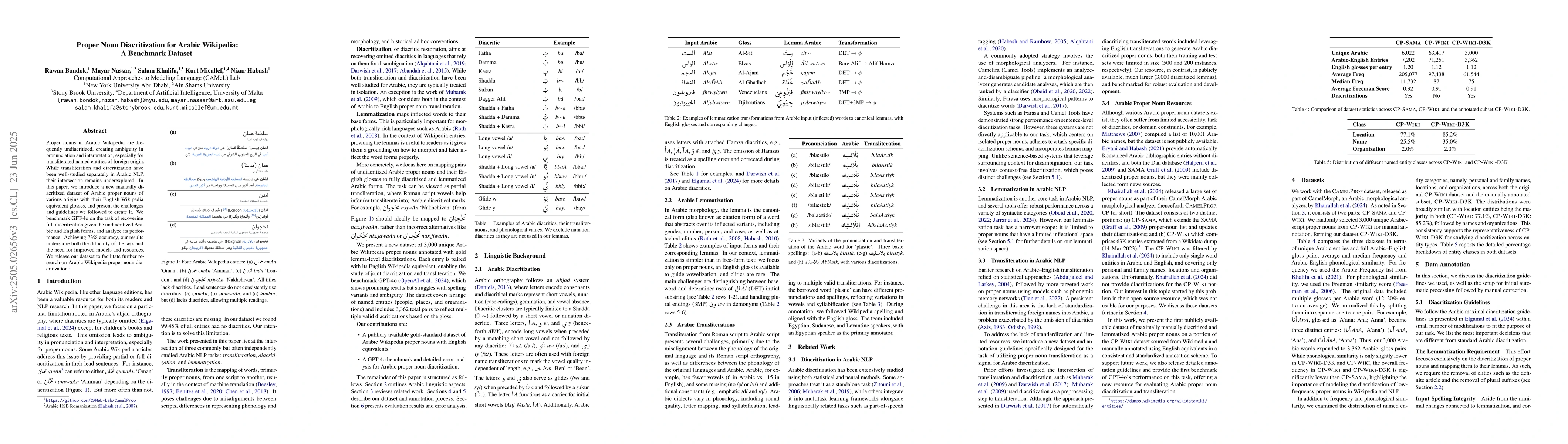 The paper introduces a manually diacritized dataset of Arabic proper names paired with their English Wikipedia glosses, following specific diacritization guidelines. GPT-4o's performance on the task of recovering full diacritization from undiacritized Arabic and English forms is benchmarked.