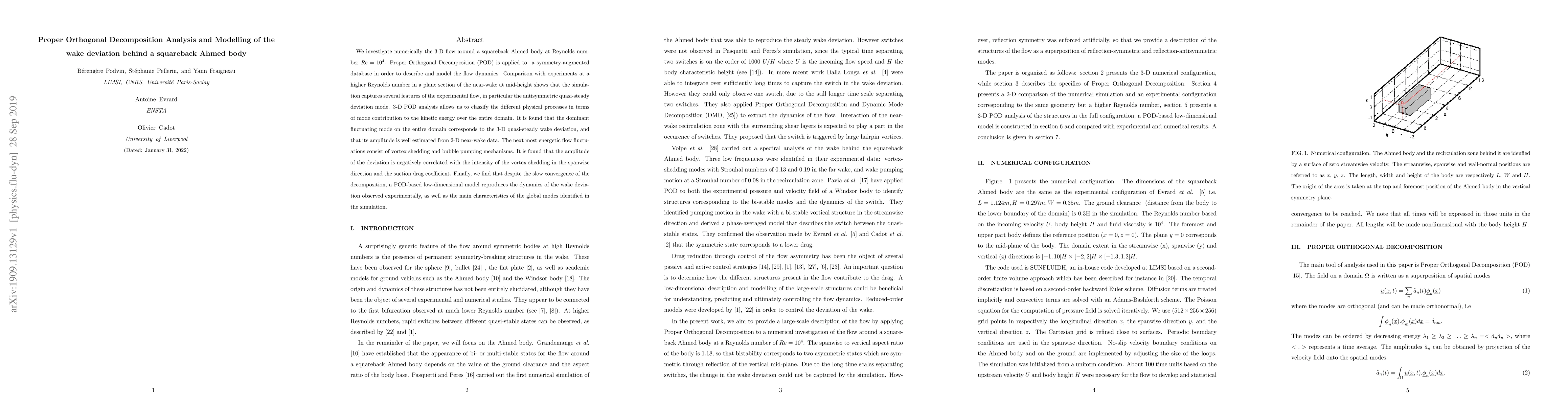 This paper uses Proper Orthogonal Decomposition (POD) to analyze and model the 3-D flow dynamics around a squareback Ahmed body at Re = 104, identifying the dominant wake deviation mode and its correlation with vortex shedding and drag. The POD-based low-dimensional model effectively reproduces experimental observations and main flow characteristics.