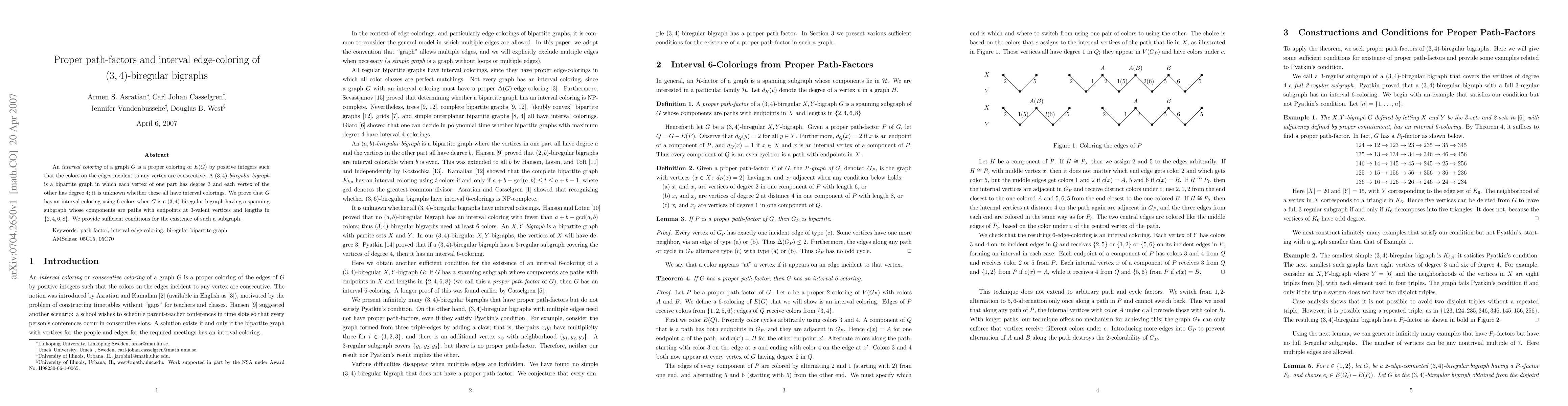 An interval coloring of a graph G is a proper coloring of E(G) by positive integers such that the colors on the edges incident to any vertex are consecutive. A (3,4)-biregular bigraph is a bipartite graph in which each vertex of one part has degree 3 and each vertex of the other has degree 4; it is unknown whether these all have interval colorings. We prove that G has an interval coloring using 6 colors when G is a (3,4)-biregular bigraph having a spanning subgraph whose components are paths with endpoints at 3-valent vertices and lengths in {2,4,6,8}. We provide sufficient conditions for the existence of such a subgraph.