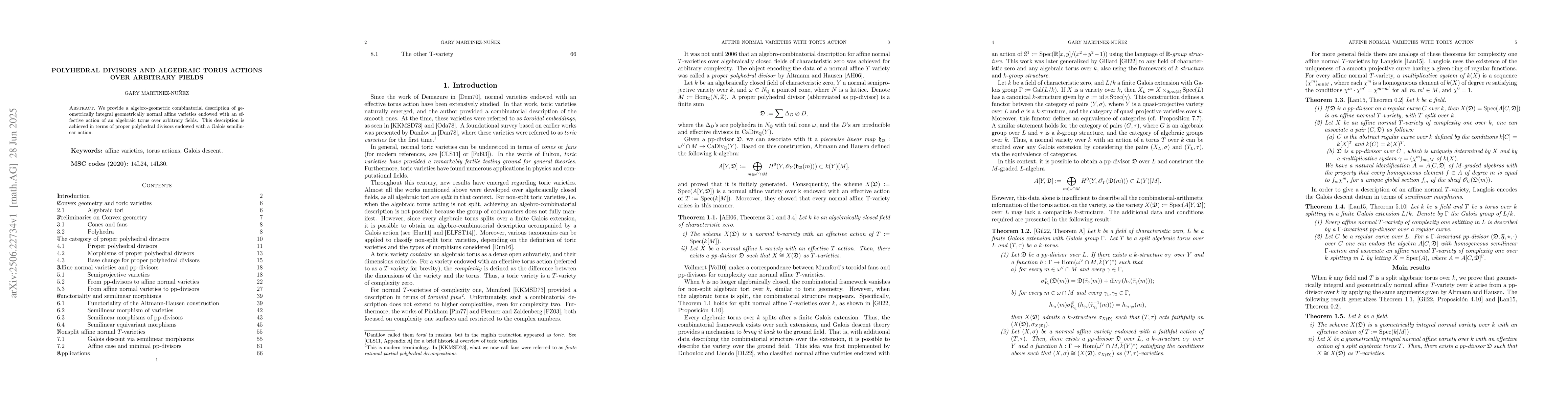We provide a algebro-geometric combinatorial description of geometrically integral geometrically normal affine varieties endowed with an effective action of an algebraic torus over arbitrary fields. This description is achieved in terms of proper polyhedral divisors endowed with a Galois semilinear action.