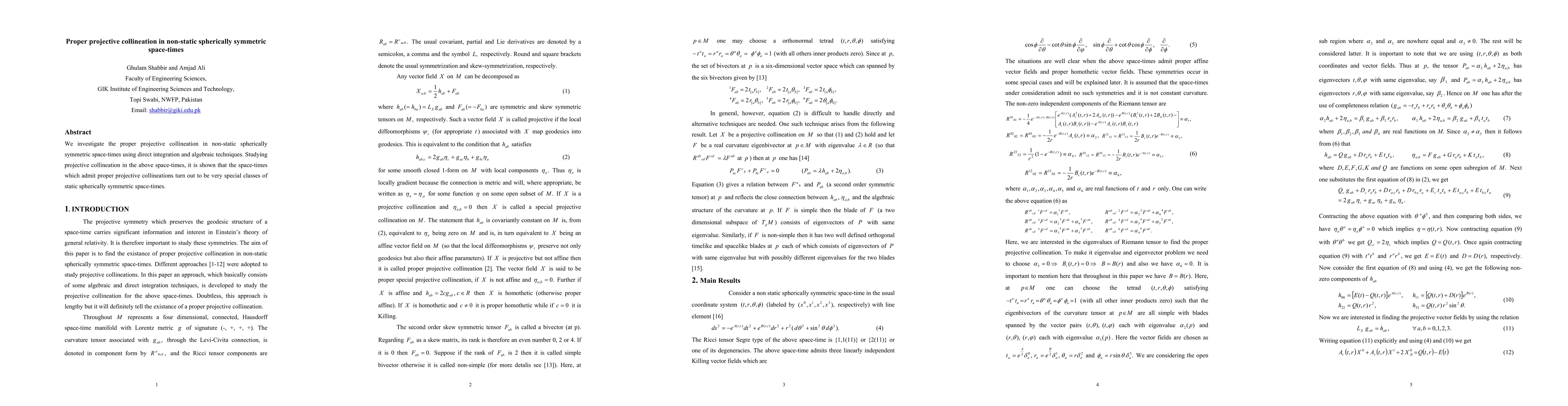 This paper explores the proper projective collineation in non-static spherically symmetric space-times through integration and algebraic methods. It concludes that space-times allowing such collineations are special static spherically symmetric space-times.