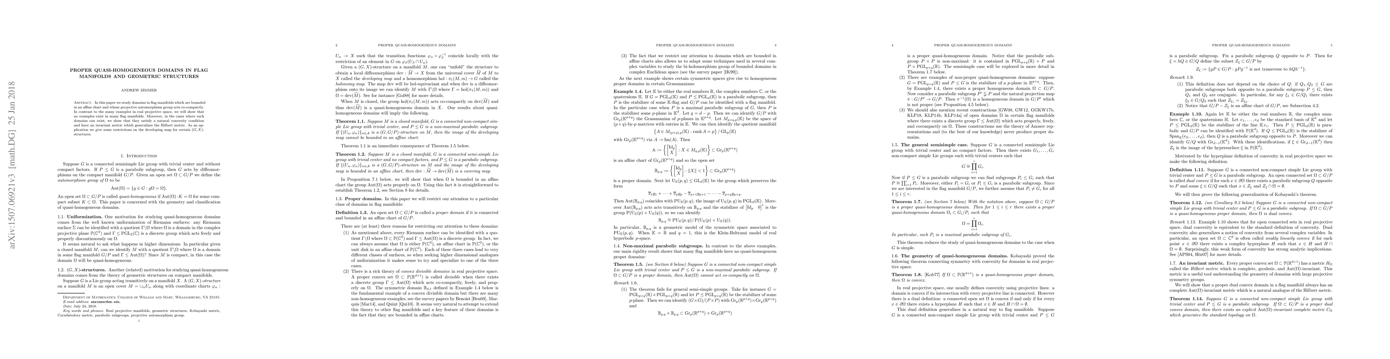 This paper investigates quasi-homogeneous domains in flag manifolds that are bounded and have a co-compact projective automorphism group, demonstrating the absence of such domains in many flag manifolds. It also shows that existing domains satisfy a convexity condition and possess an invariant metric generalizing the Hilbert metric, with applications to $(G,X)$-structures.