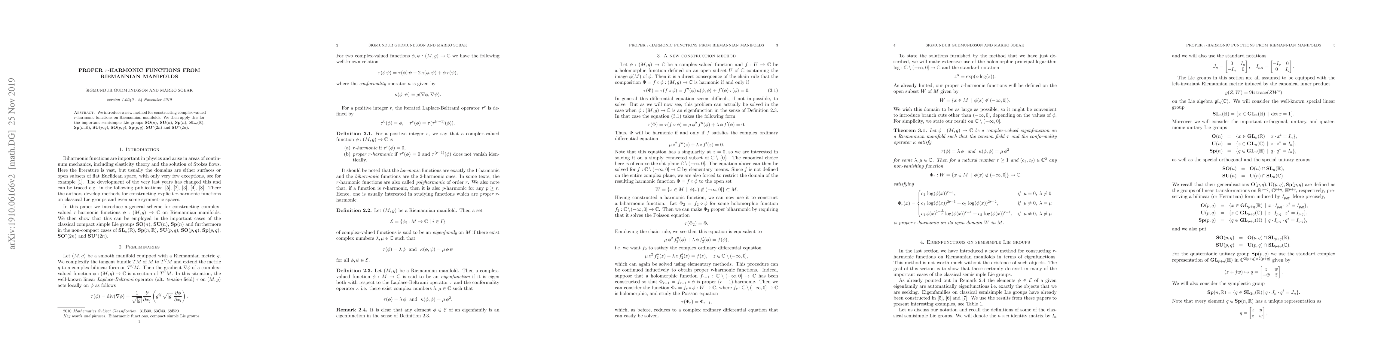 We introduce a new method for constructing complex-valued $r$-harmonic functions on Riemannian manifolds. We then apply this method for the important semisimple Lie groups $SO(n)$, $SU(n)$, $Sp(n)$, $SL_n(R)$, $Sp(R,n)$, $SU(p,q)$, $SO(p,q)$, $Sp(p,q)$, $SO^*(2n)$ and $SU^*(2n)$.