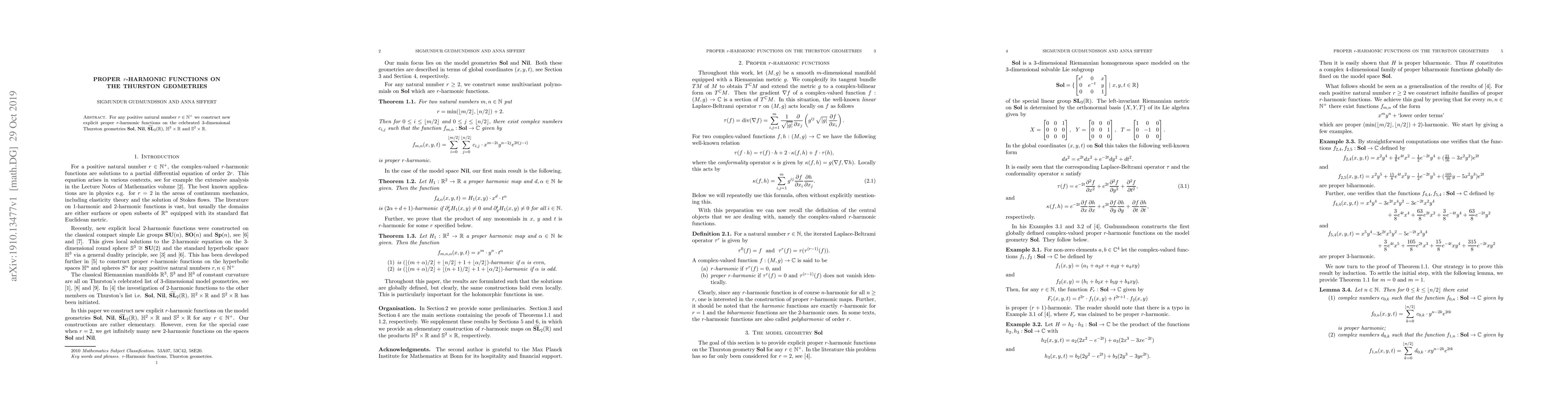 For any positive natural number $r\in\N^+$ we construct new explicit proper $r$-harmonic functions on the celebrated $3$-dimensional Thurston geometries $\Sol$, $\Nil$, $\SL2$, $\H^2\times\rn$ and $\s^2\times\rn$.