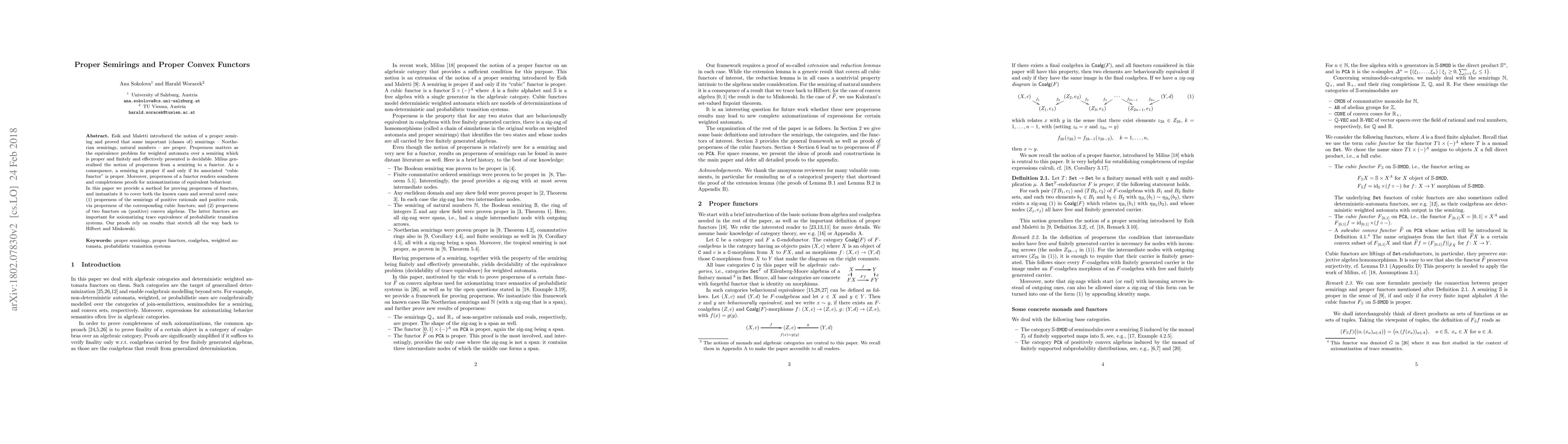 This paper introduces a method for proving the properness of functors, applying it to demonstrate the properness of semirings of positive rationals and reals, and two functors on convex algebras, which are crucial for axiomatizing trace equivalence in probabilistic transition systems. The proofs leverage foundational results from Hilbert and Minkowski.