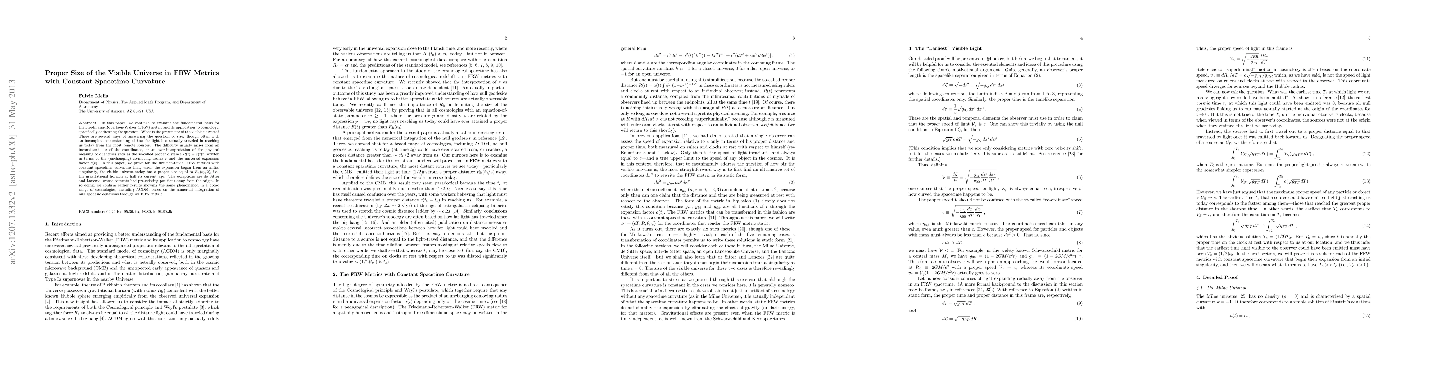 This paper investigates the proper size of the visible universe within the Friedmann-Robertson-Walker (FRW) metric framework, demonstrating that in static FRW spacetimes starting from an initial singularity, the visible universe's size today equals the gravitational horizon at half its current age, except for de Sitter and Lanczos metrics.