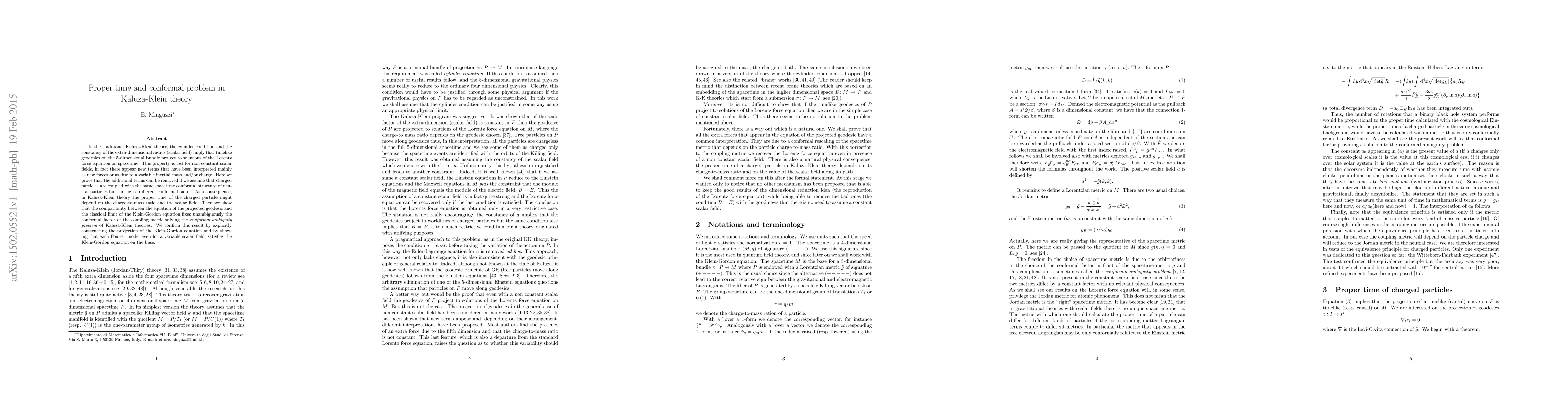 In the traditional Kaluza-Klein theory, the cylinder condition and the constancy of the extra-dimensional radius (scalar field) imply that timelike geodesics on the 5-dimensional bundle project to solutions of the Lorentz force equation on spacetime. This property is lost for non constant scalar fields, in fact there appear new terms that have been interpreted mainly as new forces or as due to a variable inertial mass and/or charge. Here we prove that the additional terms can be removed if we assume that charged particles are coupled with the same spacetime conformal structure of neutral particles but through a different conformal factor. As a consequence, in Kaluza-Klein theory the proper time of the charged particle might depend on the charge-to-mass ratio and the scalar field. Then we show that the compatibility between the equation of the projected geodesic and the classical limit of the Klein-Gordon equation fixes unambiguously the conformal factor of the coupling metric solving the `conformal ambiguity problem' of Kaluza-Klein theories. We confirm this result by explicitly constructing the projection of the Klein-Gordon equation and by showing that each Fourier mode, even for a variable scalar field, satisfies the Klein-Gordon equation on the base.