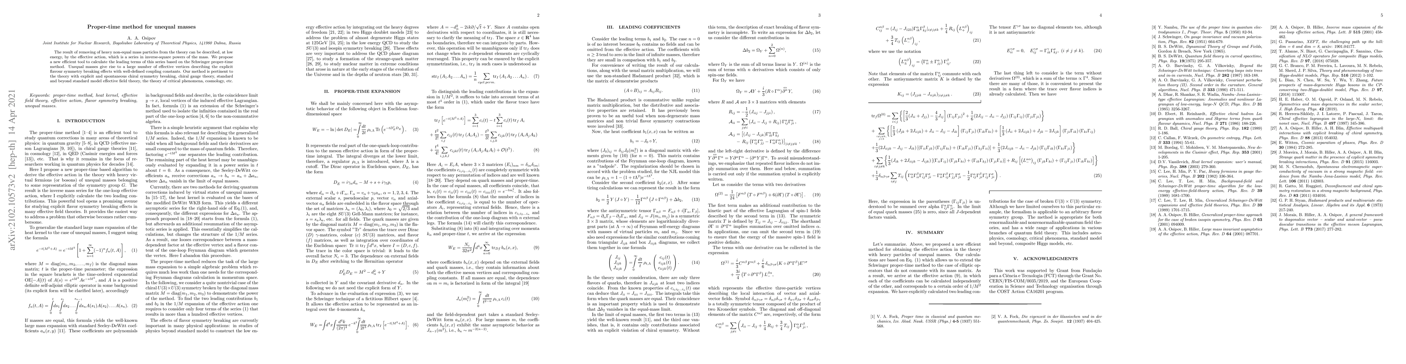 The result of removing of heavy non-equal mass particles from the theory can be described, at low energy, by the effective action, which is a series in inverse-square powers of the mass. We propose a new efficient tool to calculate the leading terms of this series based on the Schwinger proper-time method. Unequal masses give rise to a large number of effective vertices describing the explicit flavour symmetry breaking effects with well-defined coupling constants. Our method is pertinent to the theory with explicit and spontaneous chiral symmetry breaking, chiral gauge theory, standard and beyond standard model effective field theory, the theory of critical phenomena, cosmology, etc.