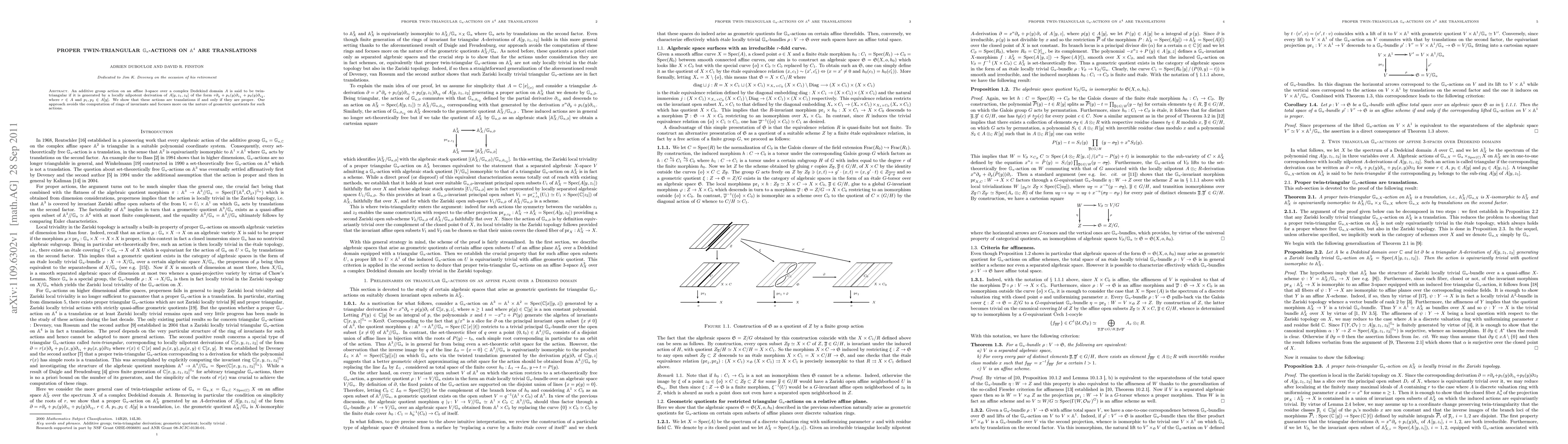 An additive group action on an affine 3 -space over a complex Dedekind domain A is said to be twin-triangular if it is generated by a locally nilpotent derivation of A[y,z,t] of the form rd/dy+p(y)d/dz + q(y)d/dt, where r belongs to A and p,q belong to A[y] . We show that these actions are translations if and only if they are proper. Our approach avoids the computation of rings of invariants and focuses more on the nature of geometric quotients for such actions.