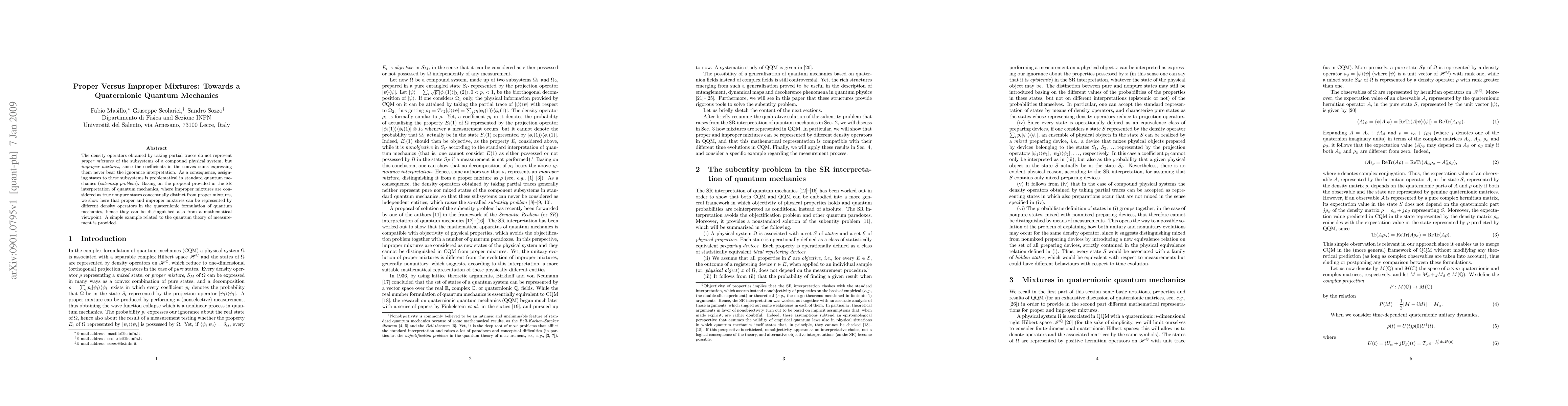 This paper argues that partial traces in quantum mechanics represent improper mixtures rather than proper ones, leading to the subentity problem. It proposes a quaternionic formulation of quantum mechanics that distinguishes between proper and improper mixtures using different density operators, offering a mathematical solution to the conceptual issue.