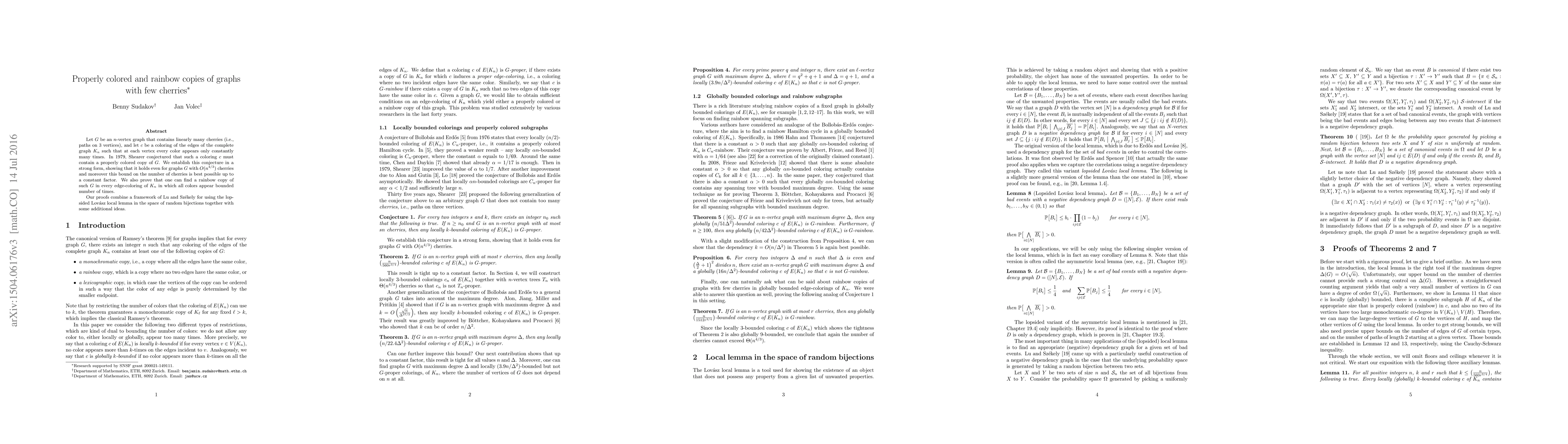 Let G be an n-vertex graph that contains linearly many cherries (i.e., paths on 3 vertices), and let c be a coloring of the edges of the complete graph K_n such that at each vertex every color appears only constantly many times. In 1979, Shearer conjectured that such a coloring c must contain a properly colored copy of G. We establish this conjecture in a strong form, showing that it holds even for graphs G with O(n^(4/3)) cherries and moreover this bound on the number of cherries is best possible up to a constant factor. We also prove that one can find a rainbow copy of such G in every edge-coloring of K_n in which all colors appear bounded number of times. Our proofs combine a framework of Lu and Szekely for using the lopsided Lovasz local lemma in the space of random bijections together with some additional ideas.