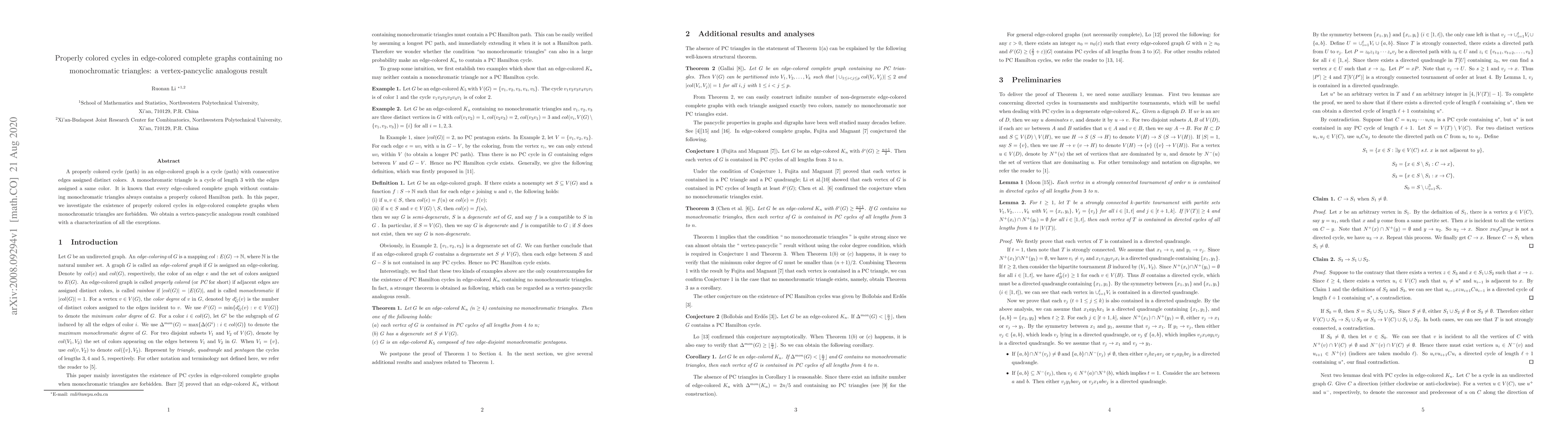 This paper explores the existence of properly colored cycles in edge-colored complete graphs that lack monochromatic triangles, proving a vertex-pancyclic analogous result and characterizing the exceptions.